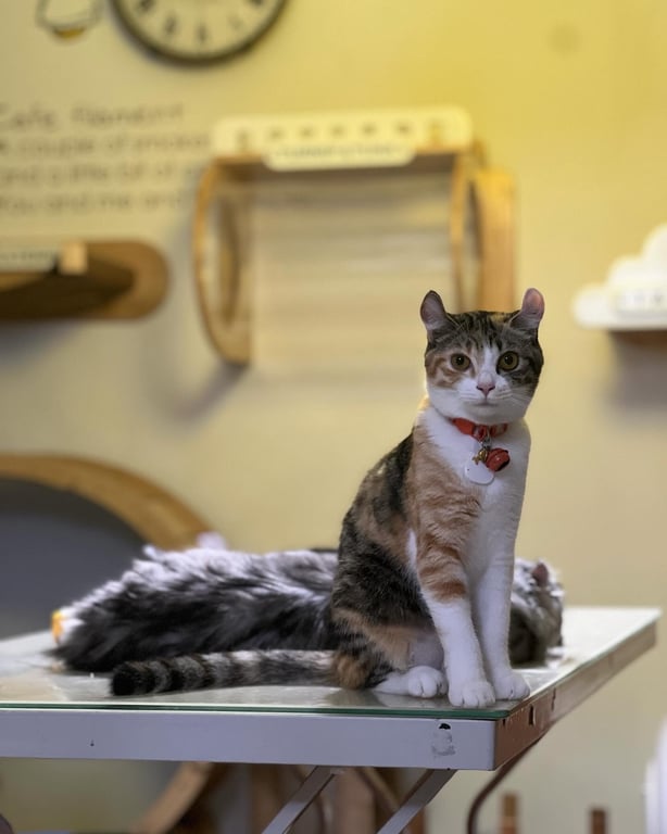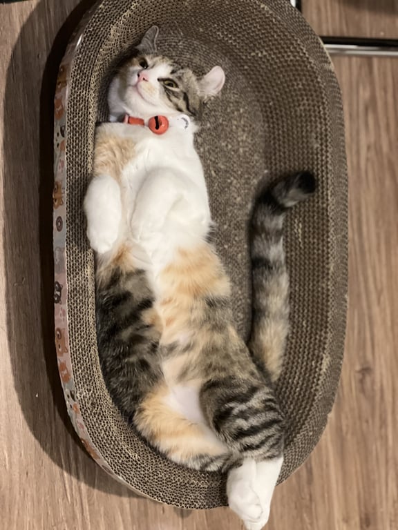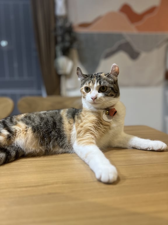 รอยตำหนิ: มีลายสีส้มที่แขนขวา เท้าขาวทั้ง4ปลอกคอสีชมพู กระดิ่งสีชมพู หูบิน