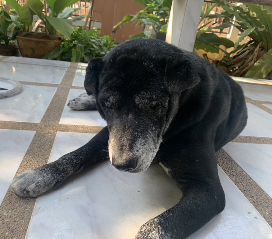 รอยตำหนิ: หูตั้ง1 ข้างหูตก1 ข้าง รอบปากมีขนสีขาว หน้าอกมีขนสีขาว อุ้งเท้าทั้ง4 มีขนสีขาว หางขนสีดำปลายหางมีขนสีขาว