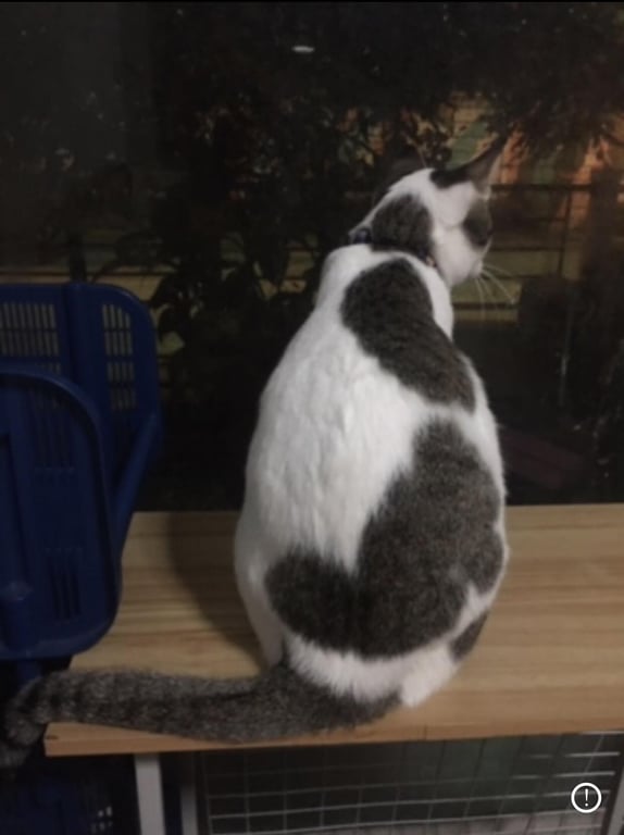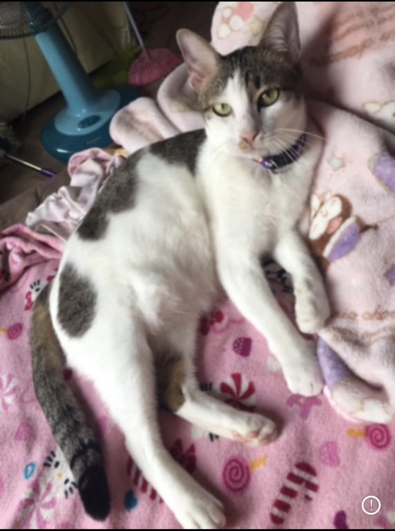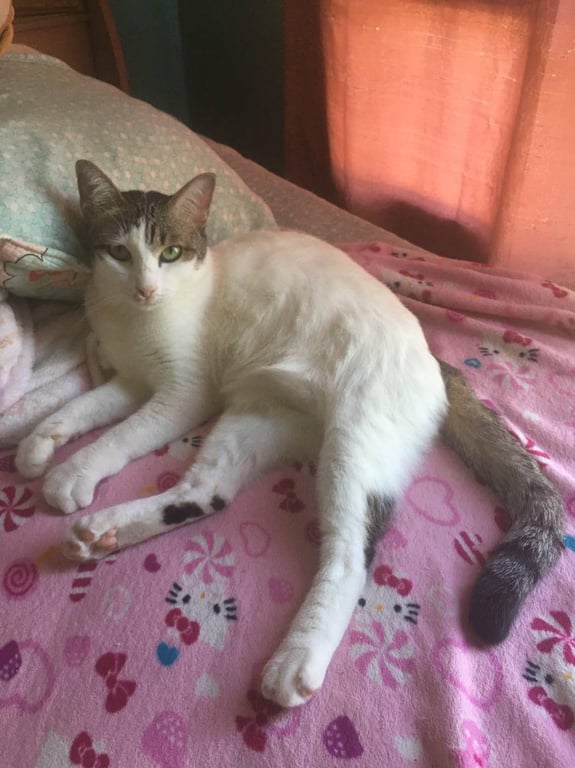 รอยตำหนิ: เวลาเดินพุงจะพุงใหญ่ๆยานๆหมือนแมวมีลูกแต่มันยังบริสุทธิ์อยู่ค่ะ แต่บางอริยาบทจะดูผอมเพียวมากค่ะ สีขาวลายสลิดที่หัวที่ขาที่หางหลัง
