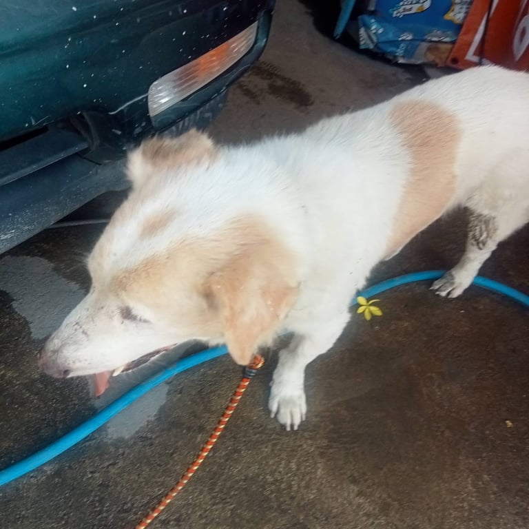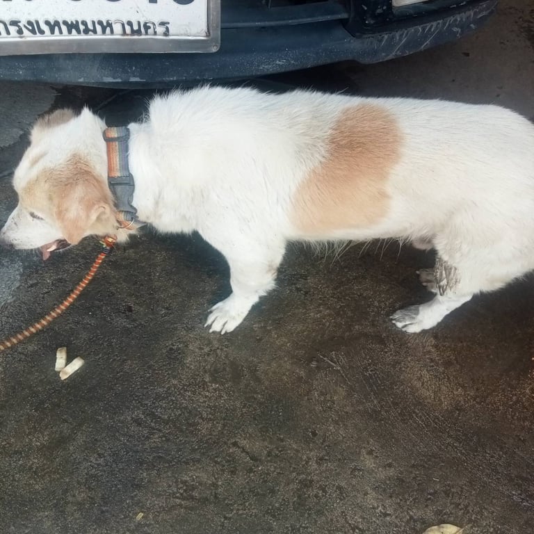 รอยตำหนิ: หูน้ำตาล ลายวัว ตาซ้ายบอด ปลอกคอสีรุ้งใจดี ไม่ดุร้าย