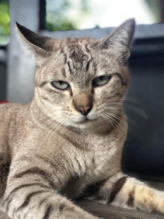 น้องขาดแคลเซียมหลังคลอดเดินเป๋ ลายสลิดสีเทา ตาสีเทา นิสัยเชื่องติดคน ไม่ดุไม่กัด น้องมีปลอกคอสีฟ้าที่คอ