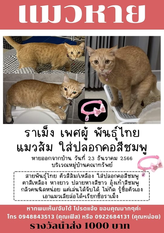 รอยตำหนิ: หางยาวสีขาววันที่หายน้องใส่ปลอกคอสีชมพูค่ะ กระดิ่งน่าจะหลุดแล้ว น้องรู้ชื่อตัวเองค่ะ เรียกราเมงบาบทีก็จะหัน แต่ค่อนข้างกลัวคน/เสียงดัง