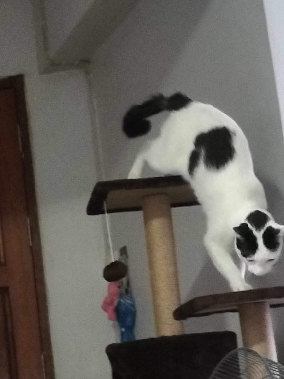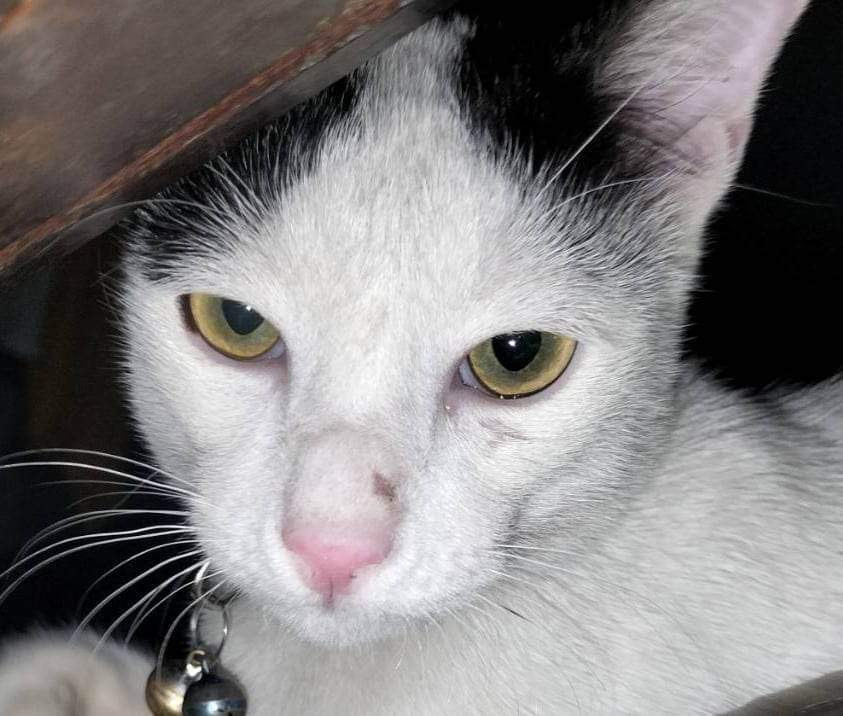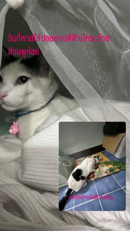 รอยตำหนิ: หางกวัก มีไข่สองสีผ่าครึ่งขาวดำ ตาสีเหลือง หางสีดำมีขาวแซมเล็กน้อย ใส่ปลอกคอสะท้อนแสงสีฟ้ามีจี้รูปกระต่ายสี่ชมพูห้อยขี้ระแวง ขอบของกิน เคยเลี้ยงระบบเปิดมาก่อน กลัวคนแปลกหน้าแต่ใช้ของกินล่อได้