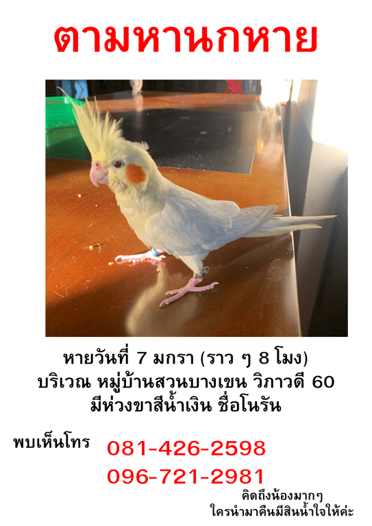 รอยตำหนิ: ใส่ห่วงขาสีฟ้าน้องชอบกินธัญพืช ติดคนมาก ๆ ขี้อ้อน ขอให้น้องปลอดภัย ใครเจอรบกวนแจ้งด้วยนะคะ เราใจจะขาดแล้ว