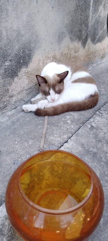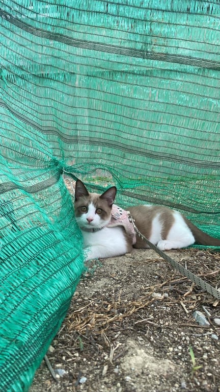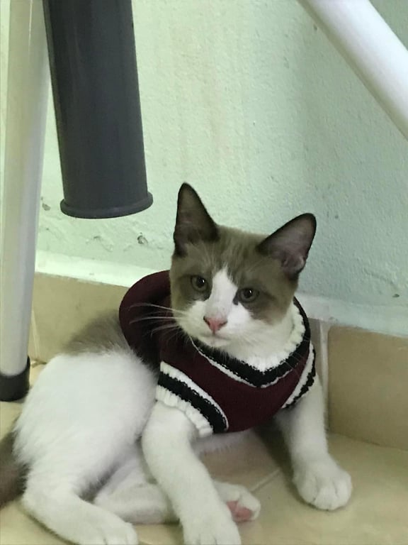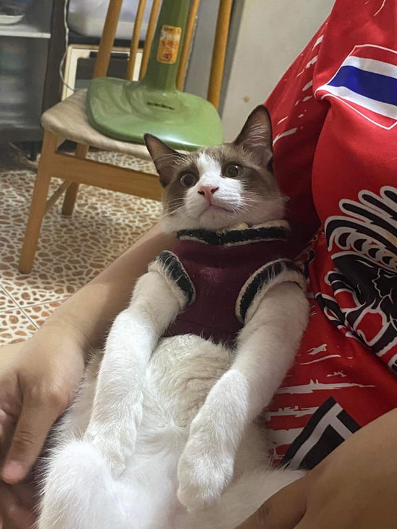 รอยตำหนิ: มีสีน้ำตาลที่ขา เล็กๆ1ข้างนิสัยขี้กลัว ชอบร้อง ขี้บ่น มีปลอกคอสีเขียวดอกไม้