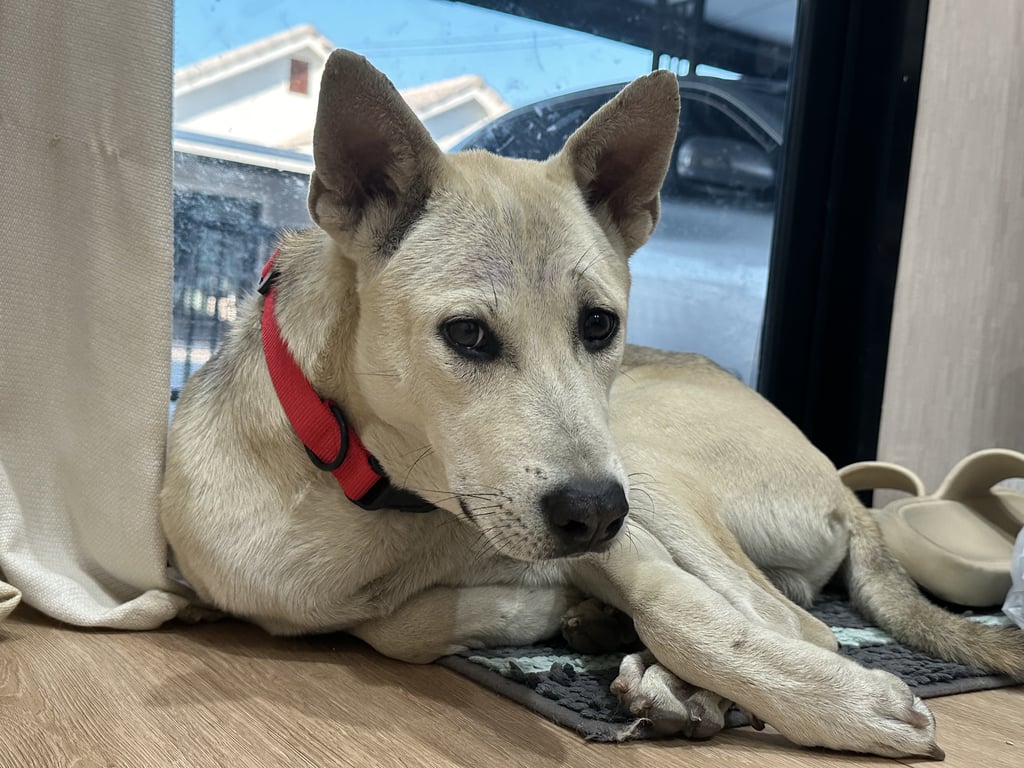 เป็นหมาขี้กลัวมากๆ สะดุ้งทุกอย่าง ไม่กัดคน ปลอกคอสีแดง ขาหลังฝั่งซ้ายมีนิ้ว 5 นิัว
