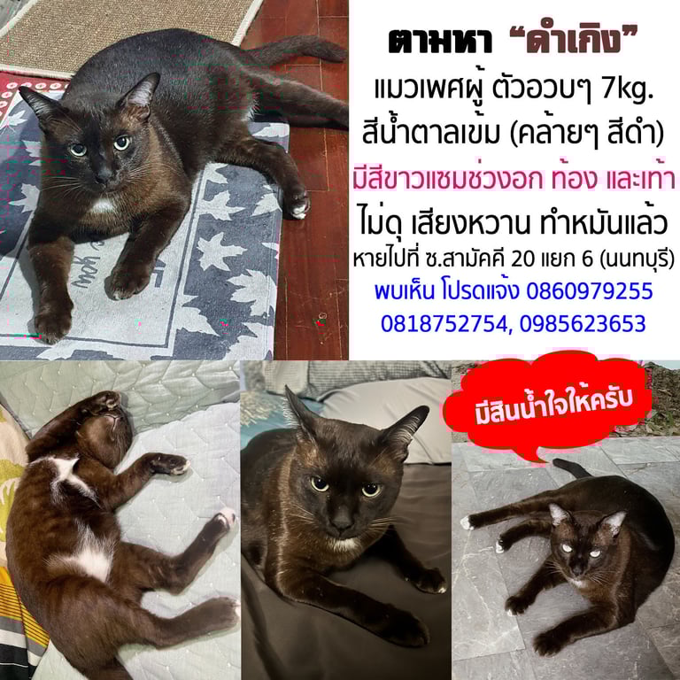 รอยตำหนิ: มีสีขาวแซมที่อก ท้อง และเท้าเสียงหวาน ไม่ดุ ขี้กลัว อวบๆ หนัก 7 กก.