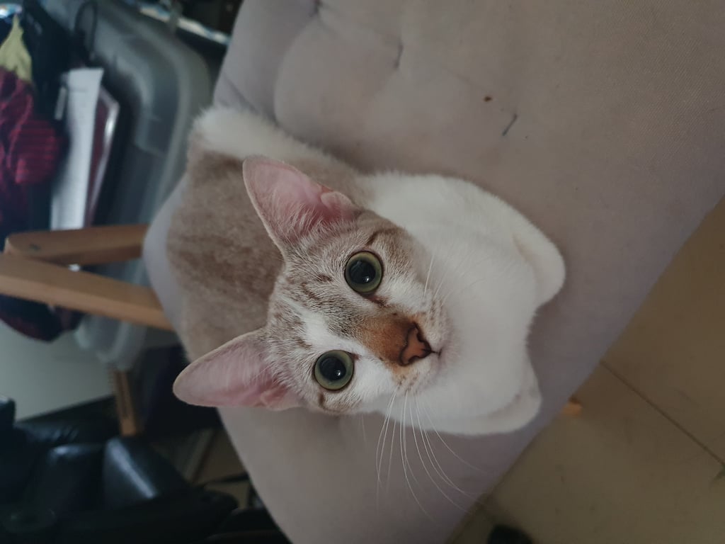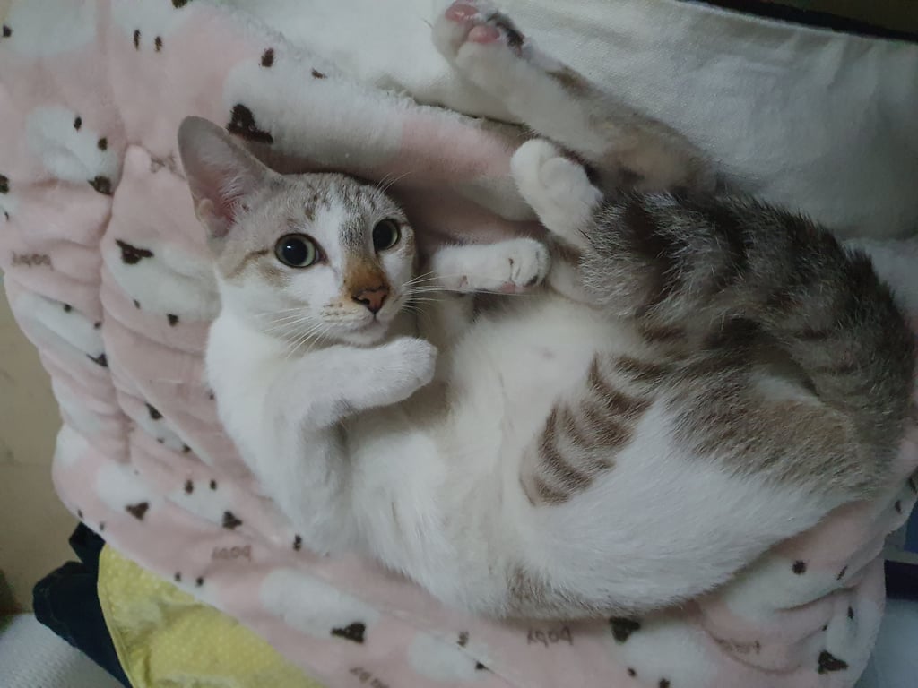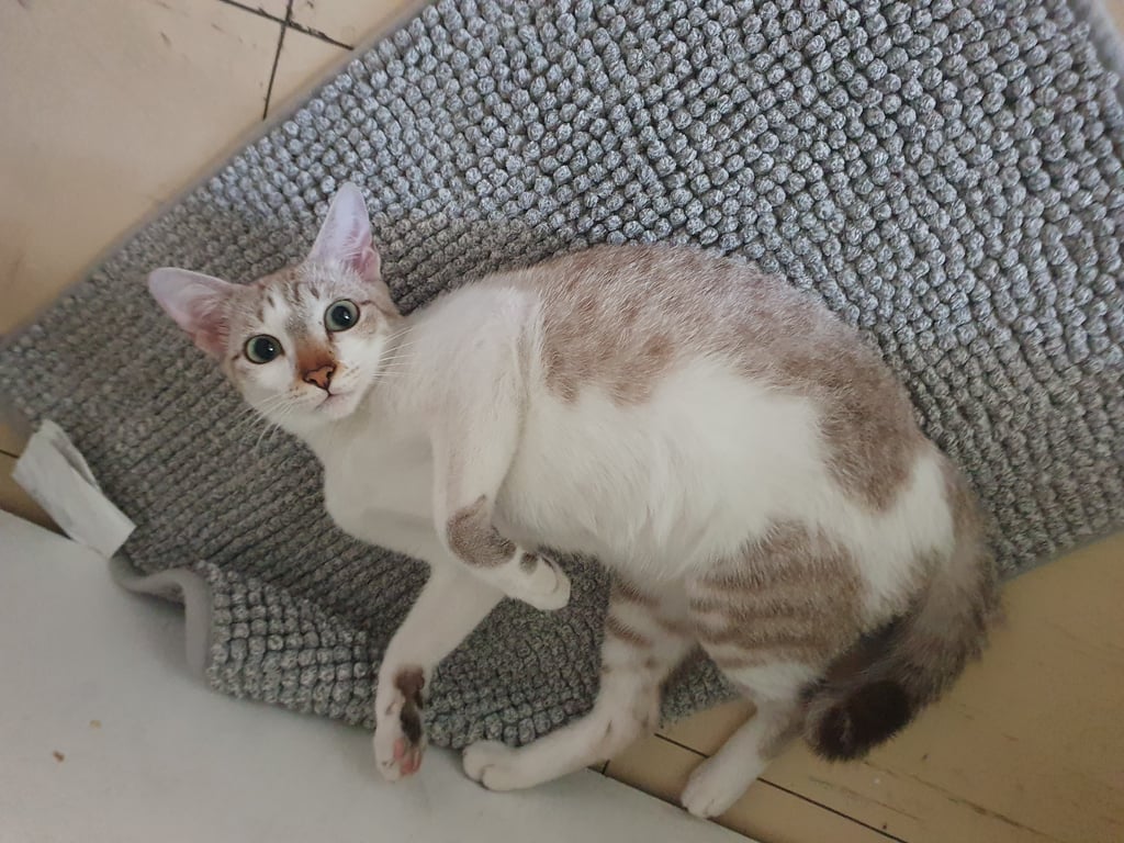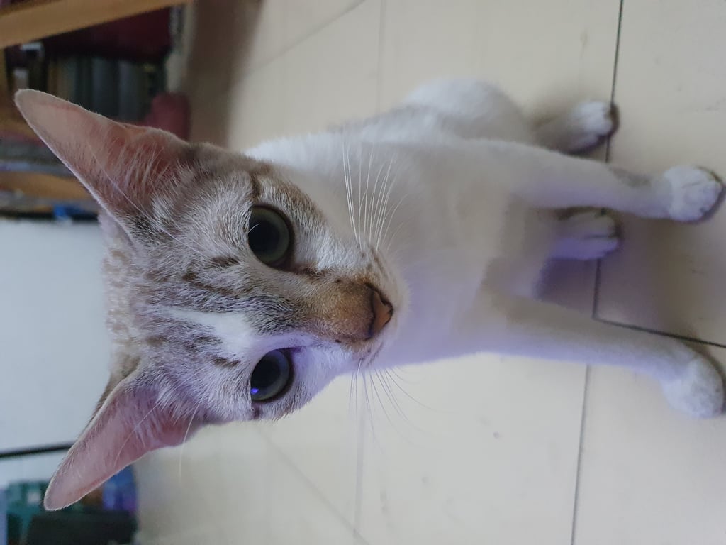 รอยตำหนิ: หางหักตัวอ้วนหนุบหนับ หัวเล็ก เคยเป็นแมวจรมาก่อน กลัวคนที่ไม่ใช่เจ้าของ