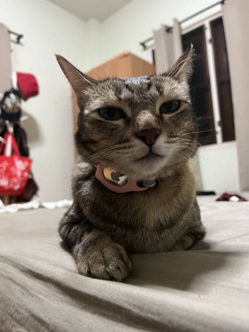 รอยตำหนิ: ใส่ปลอกคอสีชมพู เเละ air tag