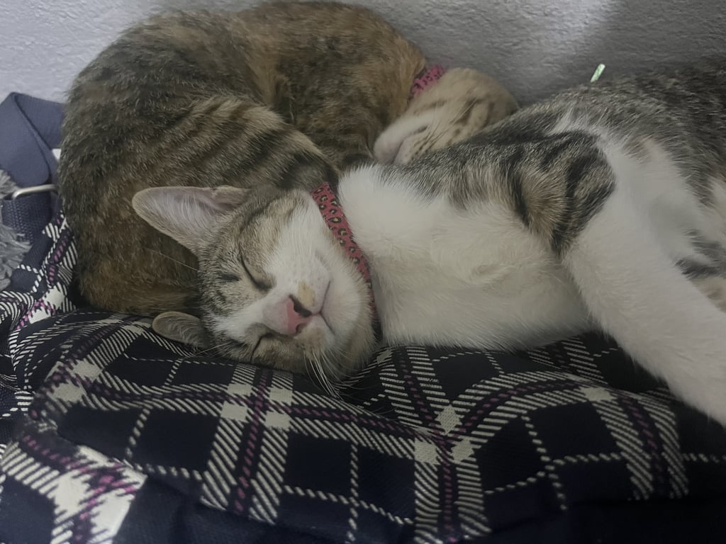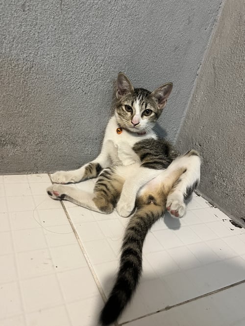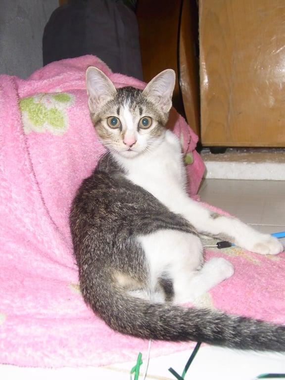 รอยตำหนิ: ปลอกคอสีชมพูลายเสือ จมูกชมพู มีแต้มสีส้มอ่อนๆตรงจมูกแมวเด็ก 4 เดือน นิสัย กลัวคนแปลกหน้า😢