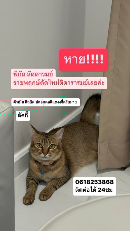รอยตำหนิ: ปลอดคอสีแดงงจี้คริสมาสประกาศหาน้องค่ะ ชื่อ ลัคกี้ ตัวเมีย สีสลิดน้ำตาล ปลอกหาแดงงเข้มจี้คริสมาส (ถ้ายังใส่อยู่) เเจ้ง 0618253868 เเพรวา ตืดต่อได้ตลอด 24 ชมค่ะ รบกวนเป็นหูเป็นตาทีนะคะหากพบเห็นช่วยเเจ่งเบาะแสพิกัดที่เจอน้องทีค่ะ 💗พิกัดที่หาย หมูบ้าน ลัดดารมย์ ราชพฤกษ์ ตัดใหม่/ติดวรารมย์เลยค่ะ (เป็นหมู่บ้านที่เพิ่งสร้างคนจะอยึ่น้อยค่ะ) จะมีแคมป์์คนงานและะบ้านพักละแวกกใกล้เคียงมีทุ่งนา คาดว่าหลุดไป6วันเเล้วค่ะ ประมานวันที่สามเจอน้องในหมูบ้านค่ะรปภช่วยกันจับแต่่น้องกัดเพราะไม่คุ้น ( น้องติดสัตว์หลุดออกไป น้องทำหมันไม่ได้นะคะมีการตรวจและะปรึกษากับหมอเฉพาะทางแล้ววด้วยโรคตั้งแต่่กำเนิด)