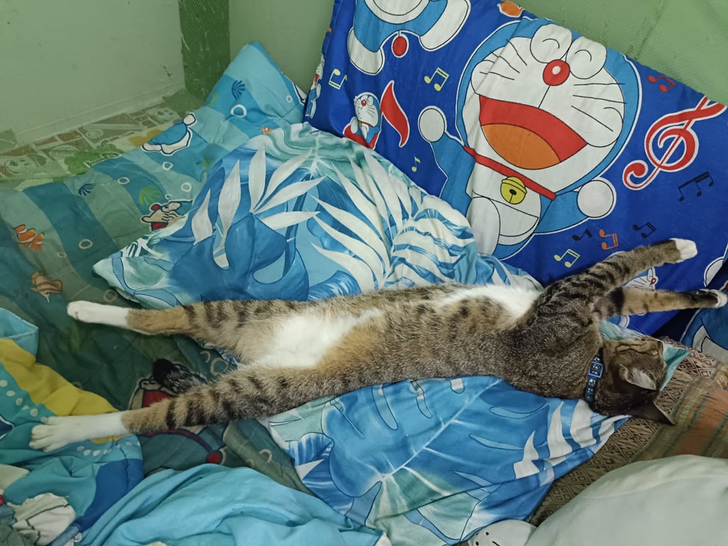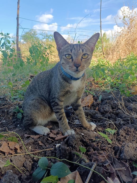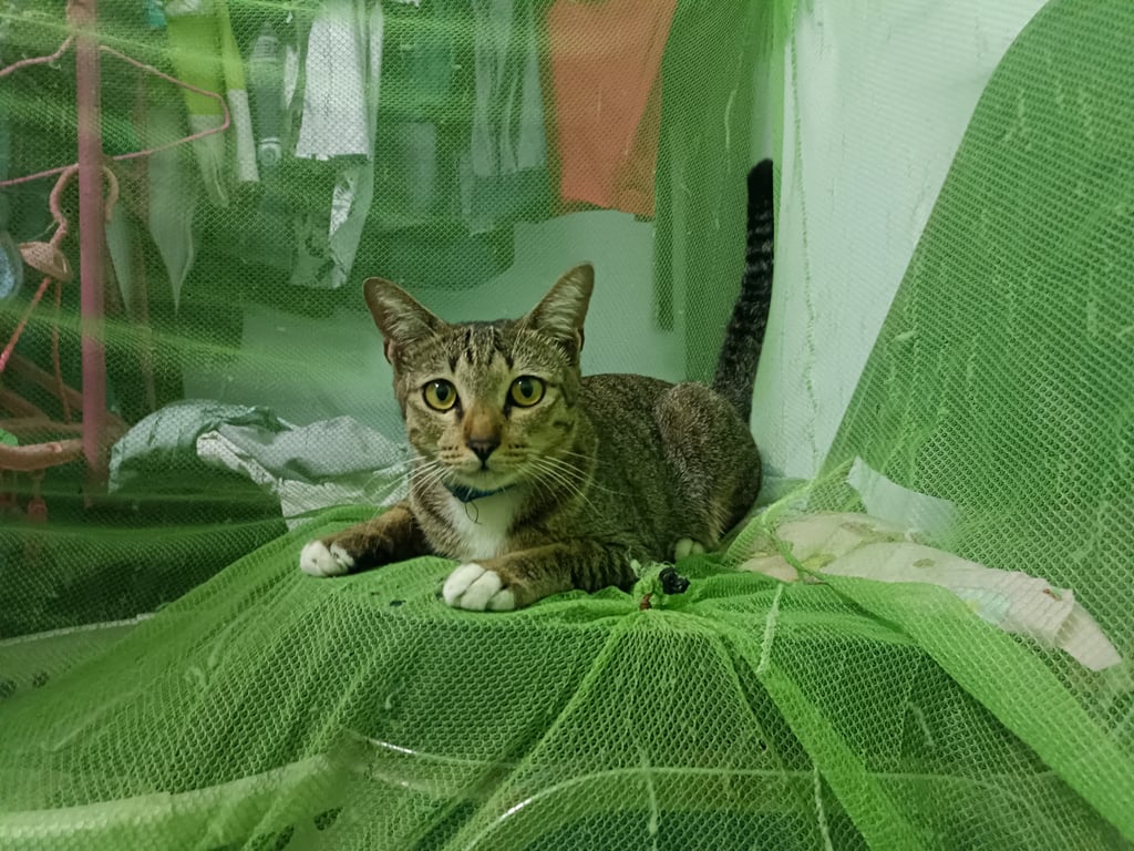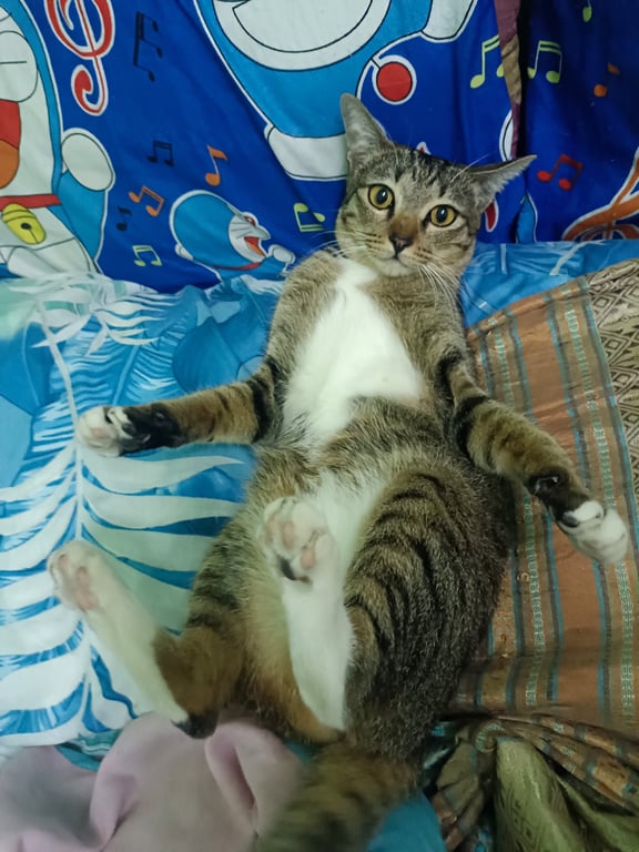 สี: ลายสลิด เท้าและมือมีสีขาว จมูกดำ ใต้เท้าหลังจะมีสีดำตรงกลาง1ข้าง ใส่ปลอกคอสีน้ำเงิน