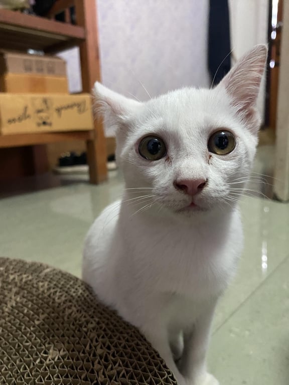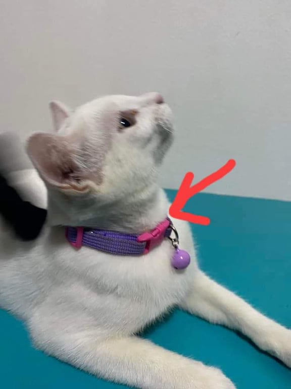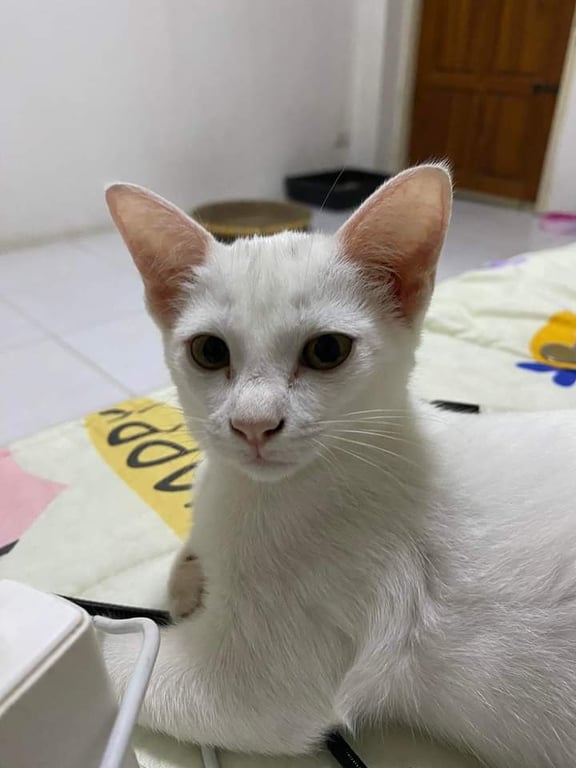 รอยตำหนิ: หางงอเป็นรูปตัว " า "มีปลอกคอสีชมพูม่วง นิสัย : กลัวคน ไม่ชินกับคนแปลกหน้า