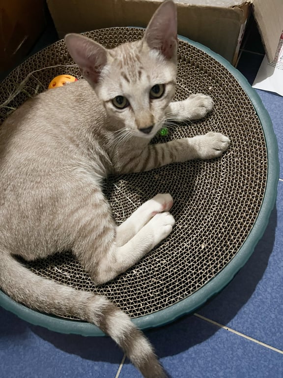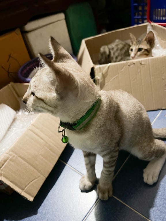 รอยตำหนิ: เท้าเป็นปื้นดำๆ คล้ายใส่ถุงเท้า ใส่ปลอกคอสีเขียว น้ำหนัก 2.3กิโลใส่ปลอกคอสีเขียว