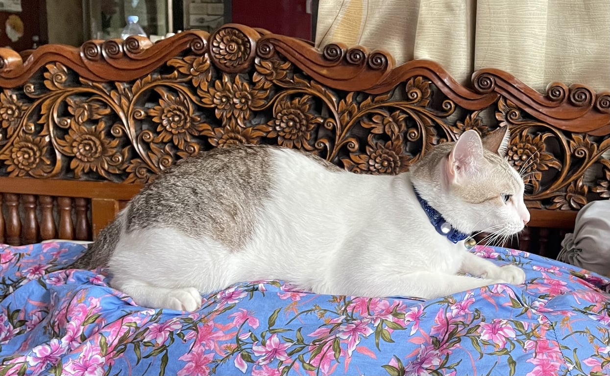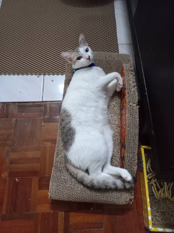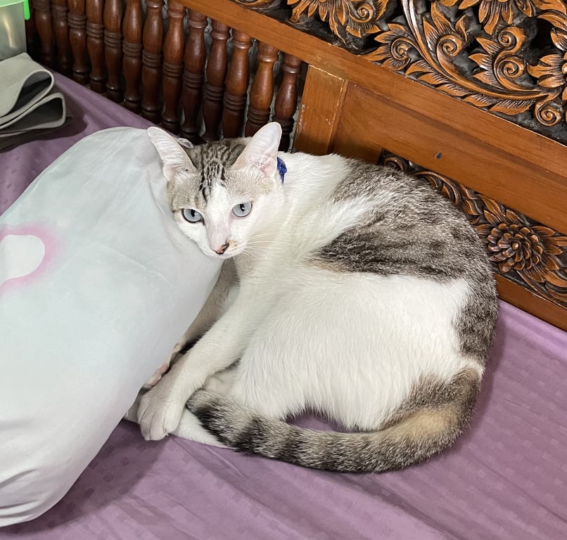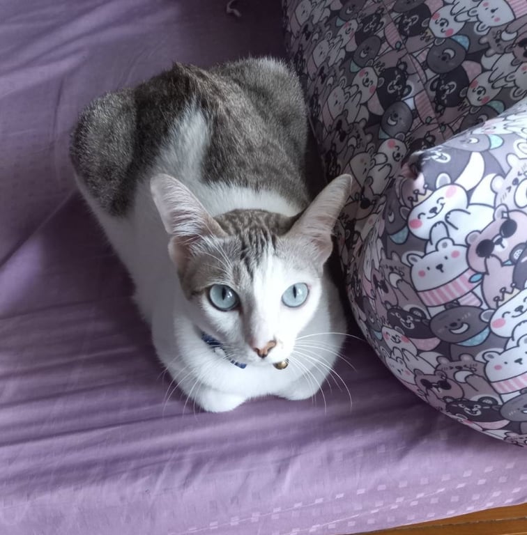 รอยตำหนิ: ใส่ปลอกคอกำมะหยี่สีน้ำเงินดิ้นเงินขี้กลัว ไม่ค่อยส่งเสียงร้อง ชอบแอบซ่อน