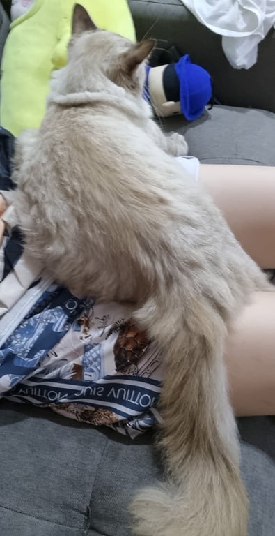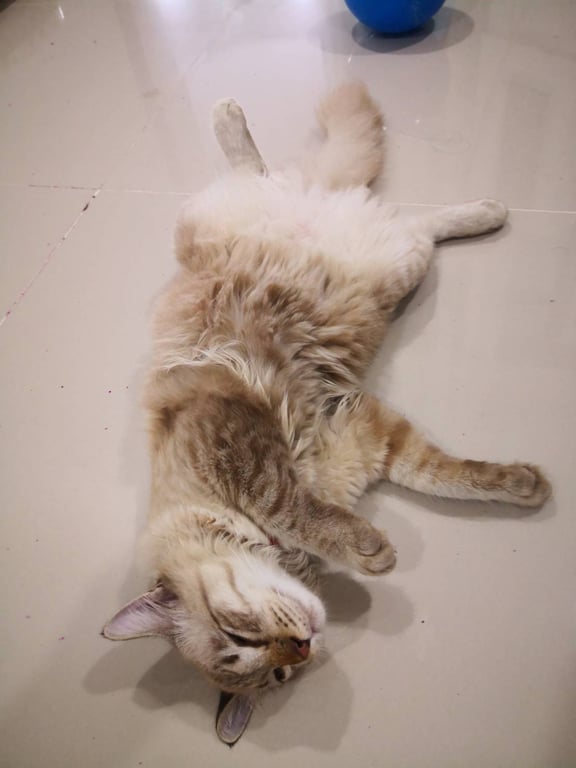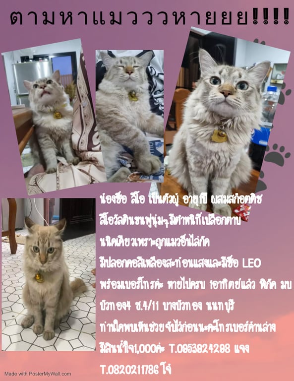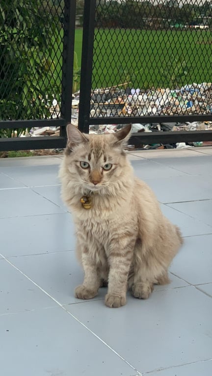 รอยตำหนิ: ปลอกคอเหลืองสะท้อนแสงมีป้ายชื่อพร้อมเบอร์โทรไม่กลัวคน ขี้อ้อนชอบนอนอย่างเดียว แต่ตกใจเสียงดังง่าย