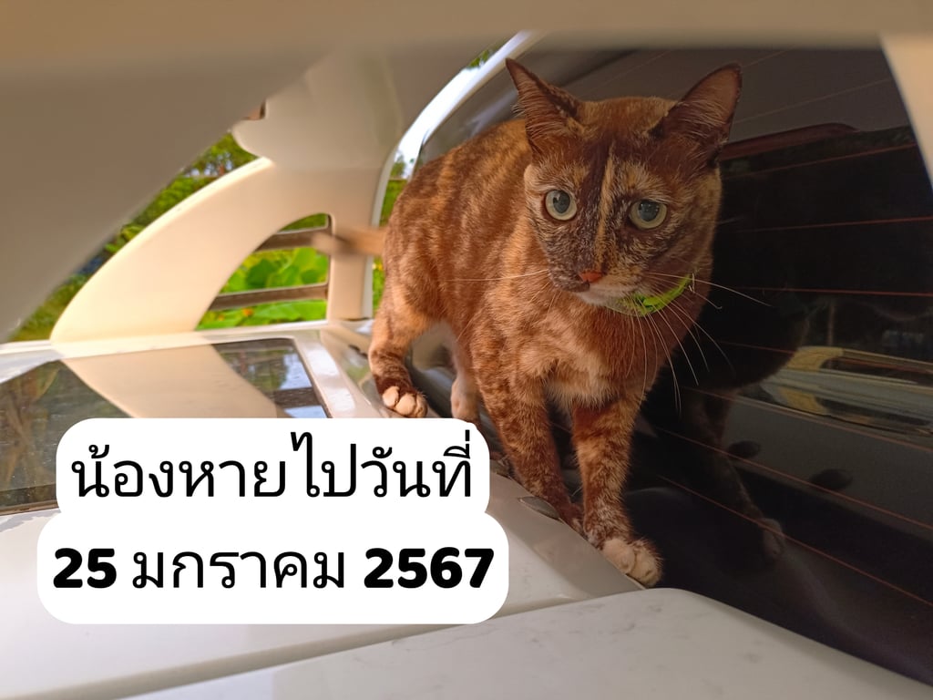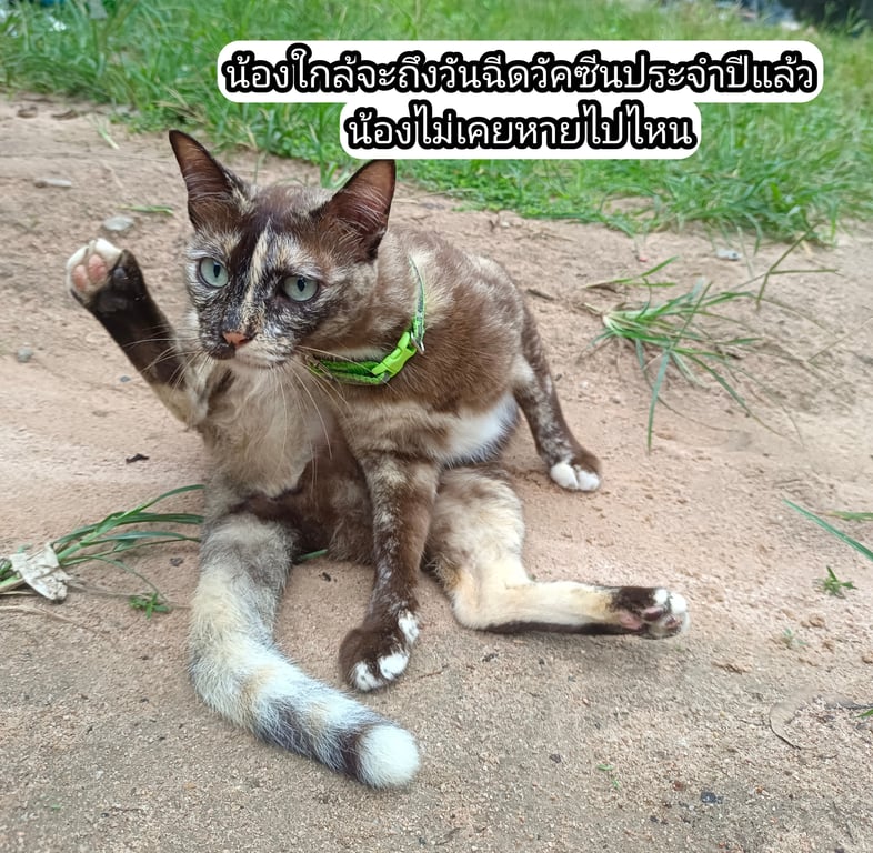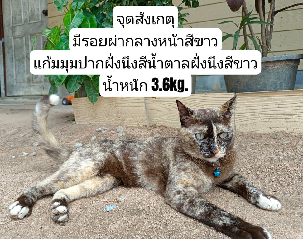 รอยตำหนิ: รอยสีขาวผ่ากลางหน้า แก้มมุมปากฝั่งนึงสีขาวฝั่งนึงสีน้ำตาล ปลายหางสีขาว ขนหน้าอกสีขาวนุ่มมอายุ4ปีกว่าๆ ทำหมันแล้ว เพศเมีย น้ำหนักตอนหาย 3.6kg