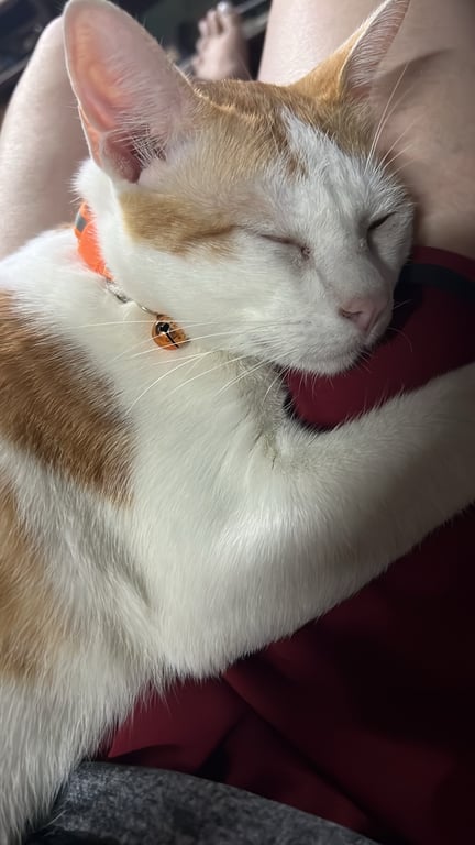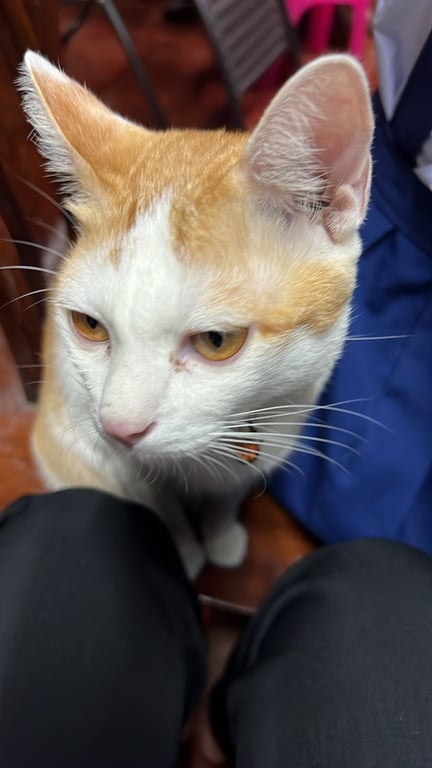รอยตำหนิ: ปลายหางกวักสีขาวส้ม มีปลอกคอสีส้ม มีกระดิ่ง ตัวอวบ ขี้กลัว ไม่เคยออกนอกบ้าน
