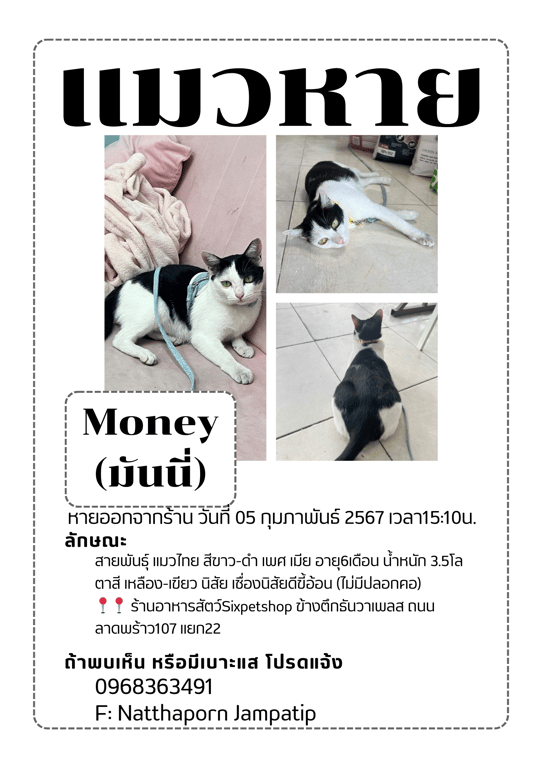 รอยตำหนิ: ที่หัวมีจุดขาวๆ 1จุดเชื่องมากก ติดคน ไม่ค่อยกลัวเสียง