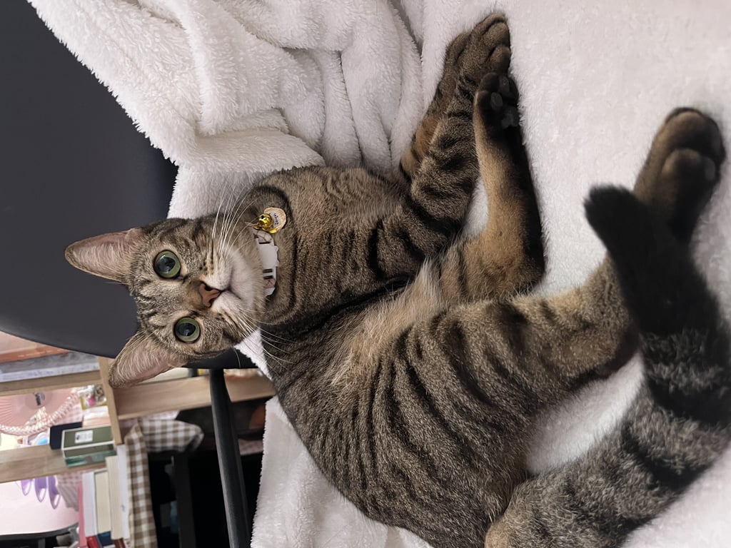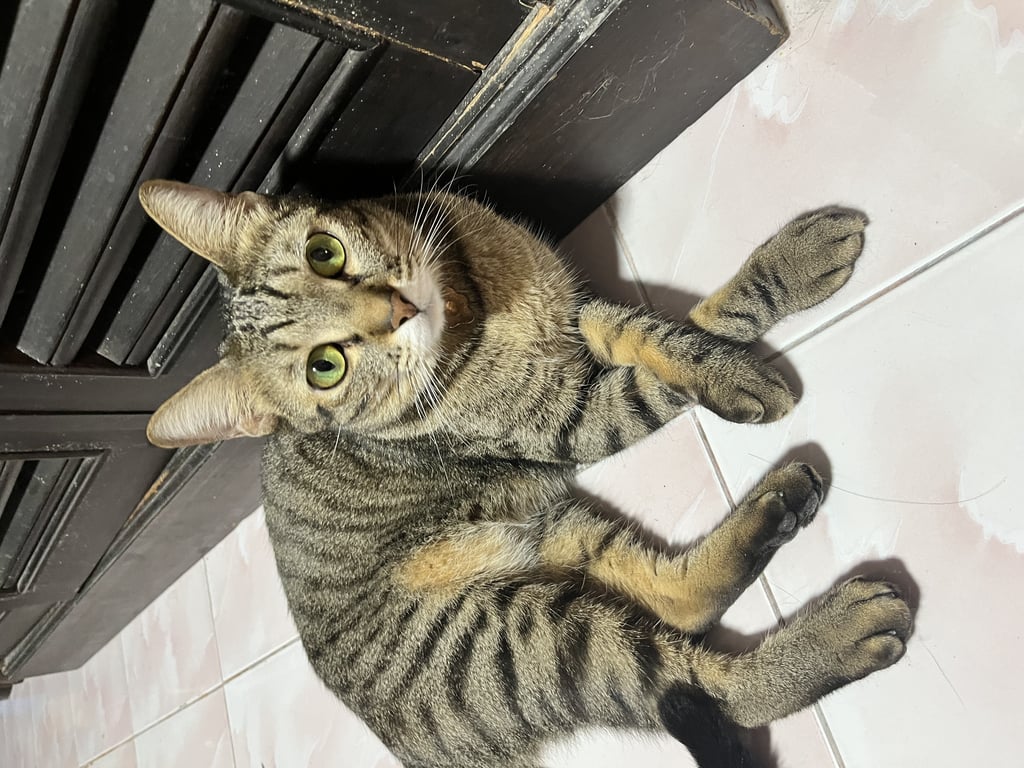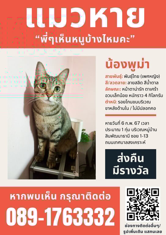 รอยตำหนิ: ปลายหางดำ ตาเศร้า อวบเล็กน้อย มีรอยโกนขนที่ขาหลังด้านในขี้อาย ไม่ขู่ ไม่กัด หนักประมาณ 4 กิโลกรัม