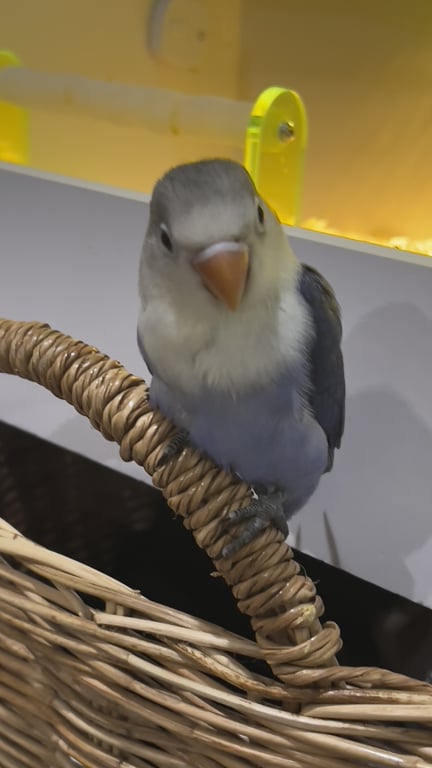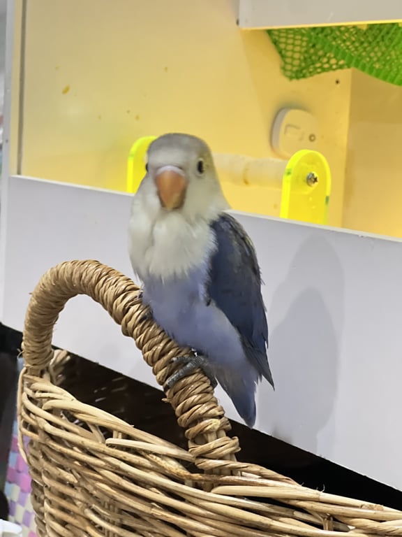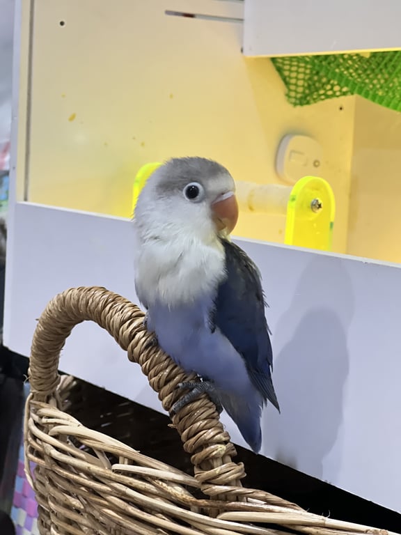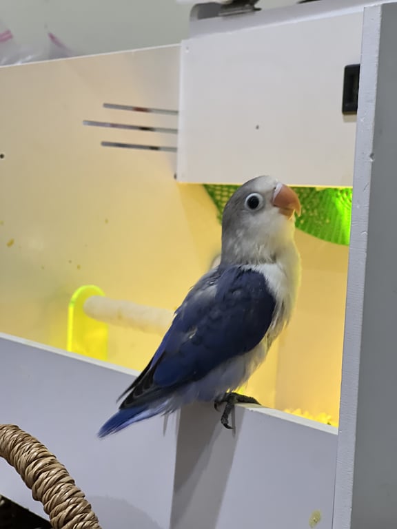 รอยตำหนิ: นกเลิฟเบิร์ด แผงหลังขนยังไม่เต็ม ขาเป็นสีดำเทา มีจุดขาวนกเลิฟเบิร์ด สีฟ้าน้ำเงิน นิสัยน่ารัก ติดคน ยังทานลูกป้อน น้องไม่กัด นกเด็ก พึ่งหัดบิน