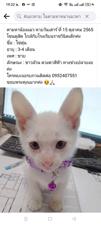 รอยตำหนิ: ใส่ปลอกคอสีม่วง ตาสีฟ้าทั้งสองข้าง หางงอและคดเกือบๆช่วงปลายหายไปวันที่ 15 ตุลาคม 2565 ช่วงเวลา 19.00 น. ไกล้กับโรงเรียนราชวินิตเด็ก