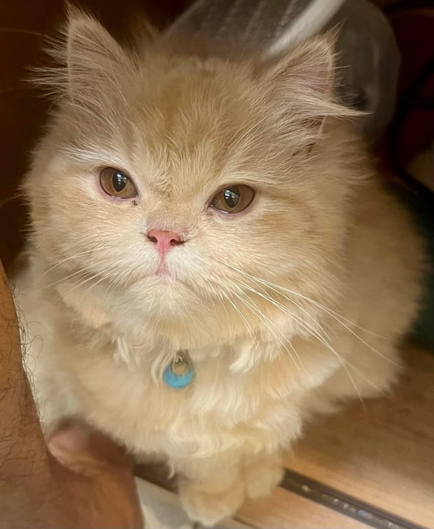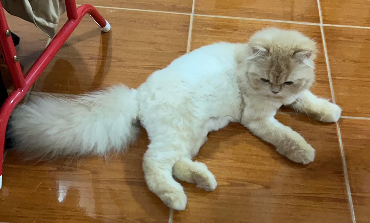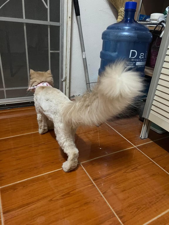 รอยตำหนิ: โดนตัดขนสั้นตรงตัว ส่วนหางขนยาว หน้าจะกลมๆพองๆใส่ปลอกคอสีชมพู กระดิ่งสีฟ้า