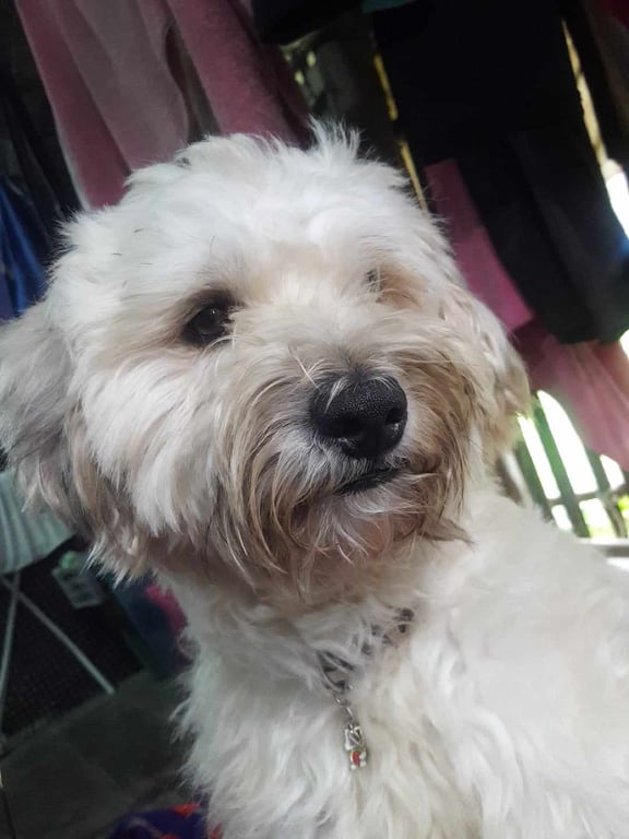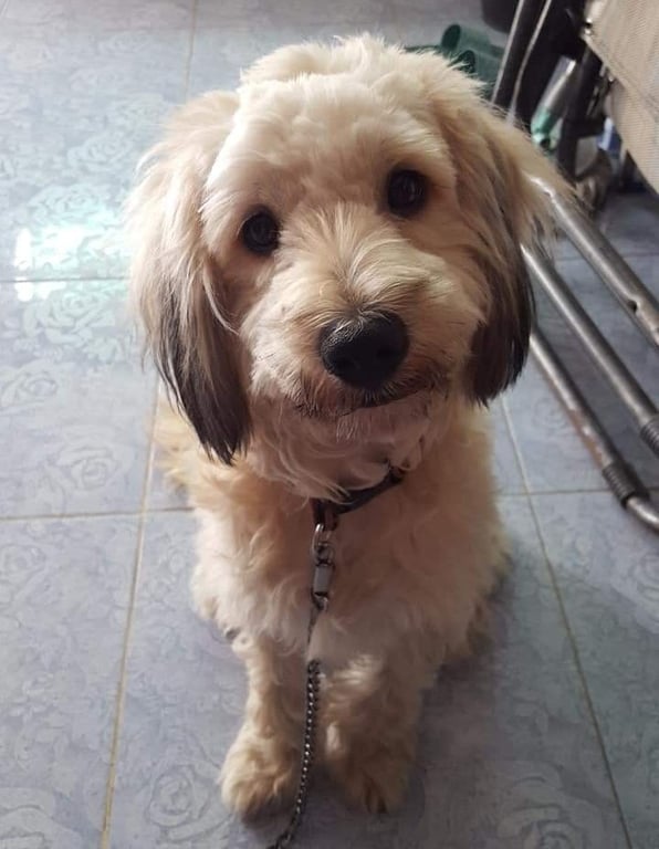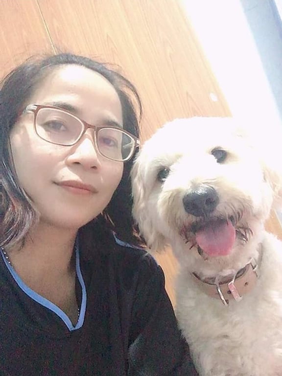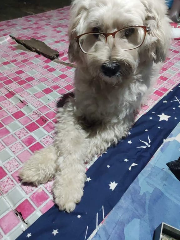รอยตำหนิ: มีสีน้ำตาลเข้มตรงข้อศอกขาหน้า และมีปานดำตรงโคนลิ้นด้านขวา เวลานอนน้องจะชอบเอาขาหน้าไขว้กันขี้เล่น ไม่กัดไม่ดุ เข้ากับคนง่าย เวลาเจอหมาใหญ่จะกัดน้องจะหมอบ