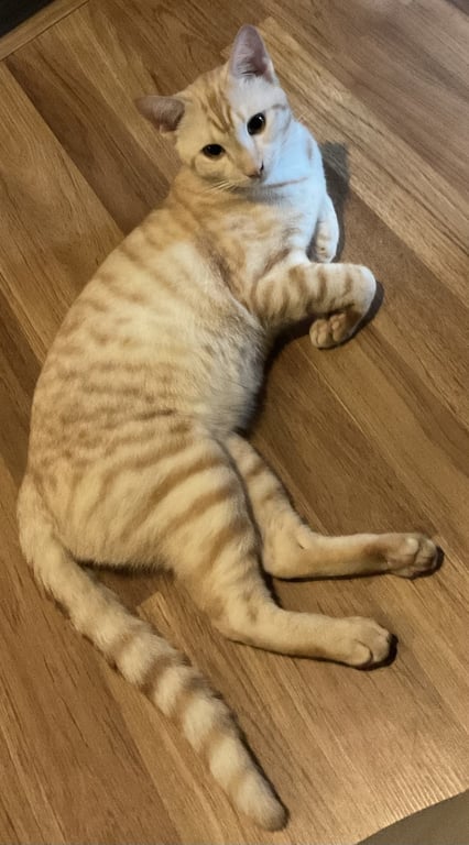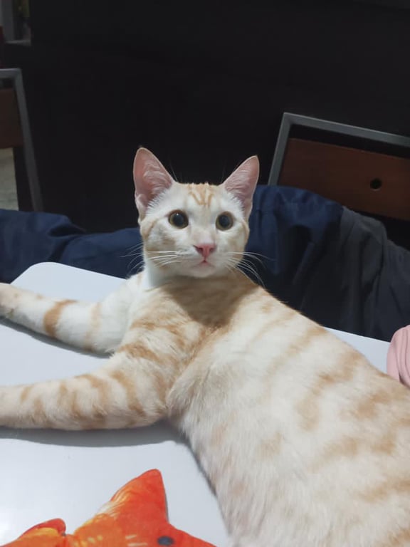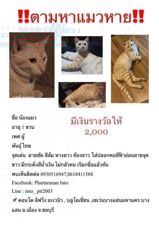 รอยตำหนิ: หางยาว ลายชัด ใส่ปลอกคอสีฟ้าอ่อน กระดิ่งสีน้ำเงินไม่กลัวคน ไม่กัด เข้ากับคนง่าย