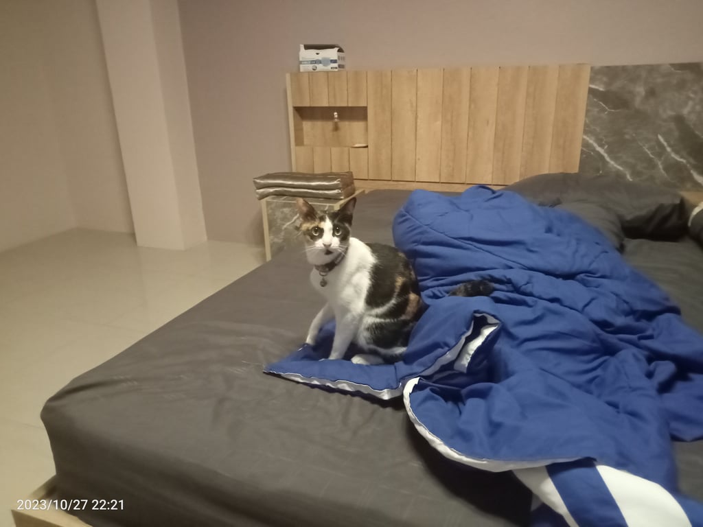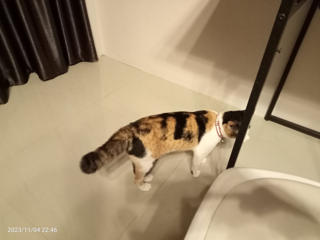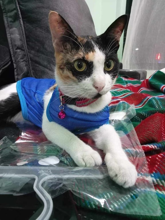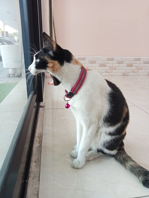รอยตำหนิ: ขอบตาดำสองข้าง หน้าอกขาว ปลายหางงอเป็นพุ่มปลอกคอสีชมพูมีแถบสะท้อนแสง กระดิ่ง2อัน