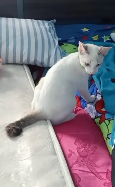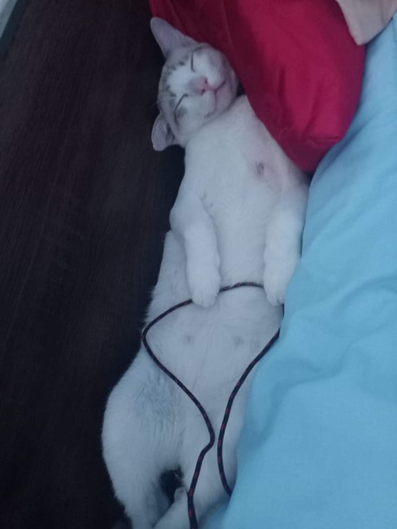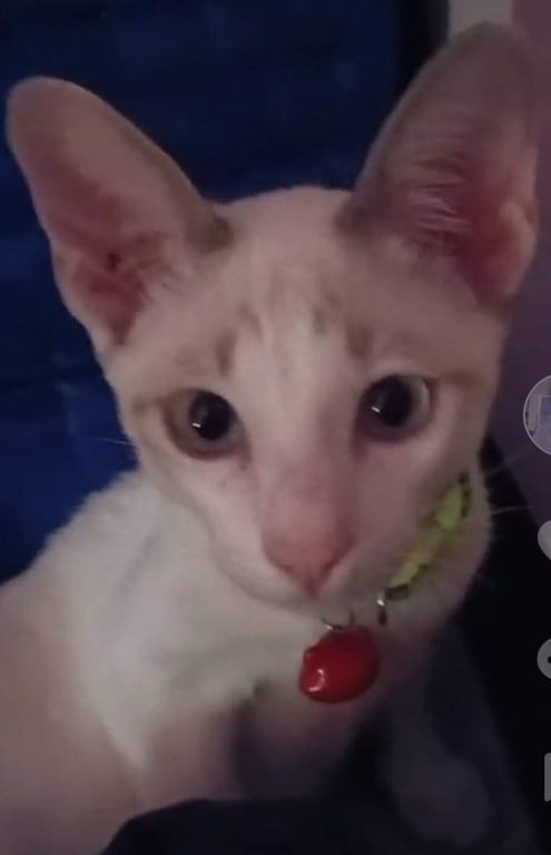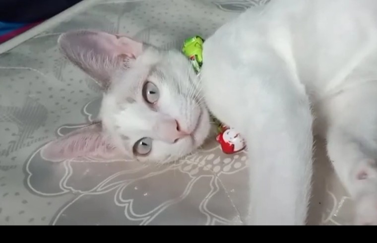 รอยตำหนิ: ตาสีฟ้าออกขาวๆหางม้วนเข้ามีข้นหลุดตรงคอใกล้ๆ