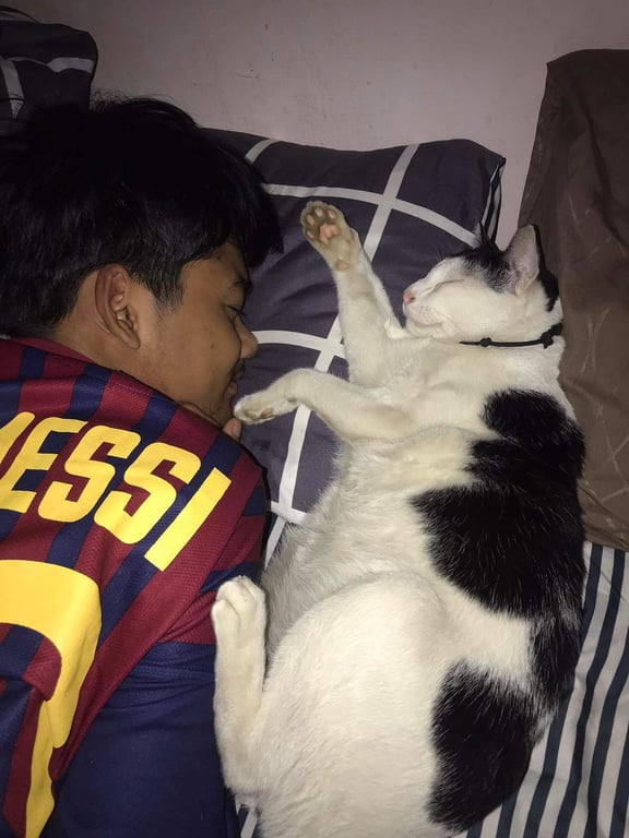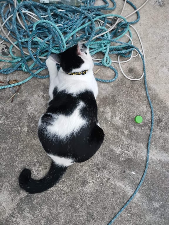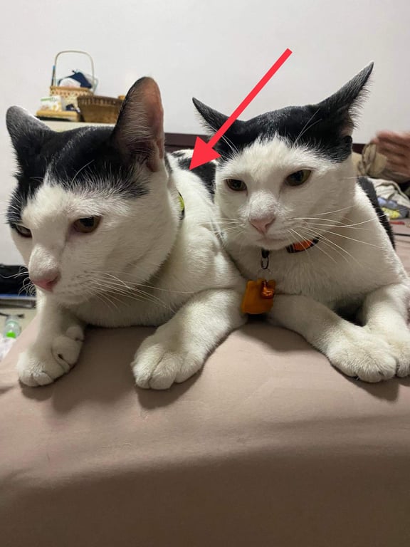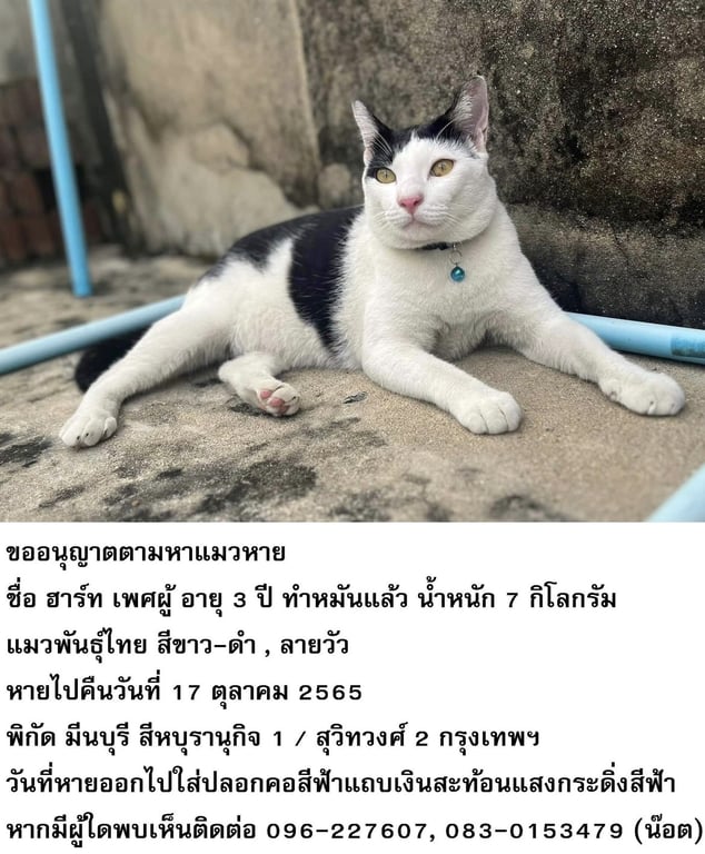 รอยตำหนิ: มีหน้าม้าปัดมาถึงหางตาขวา ขาขาวล้วนทั้ง 4 ขา ท้องขาวล้วน หางดำล้วนมีงอปลาย น้ำหนัก 7 กิิโลกรัมนิสัยเป็นแมวไม่ค่อยกลัวคน แต่กลัวเสียงรถเป็นอย่างมาก มีรูปร่างอวบ ใส่ปลอกคอสีฟ้าแถบเงินสะท้อนแสง กระดิ่งฟ้า