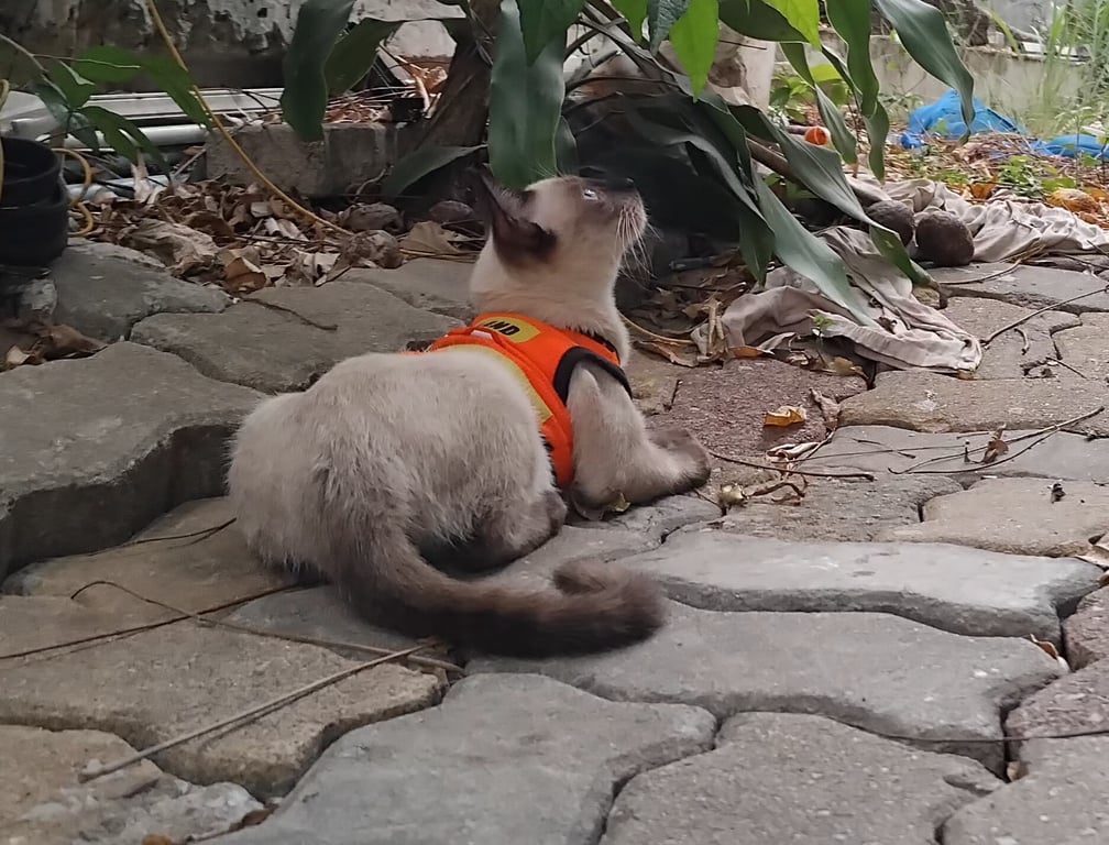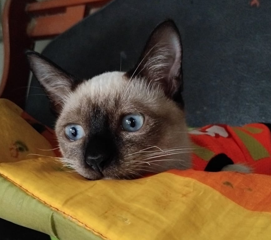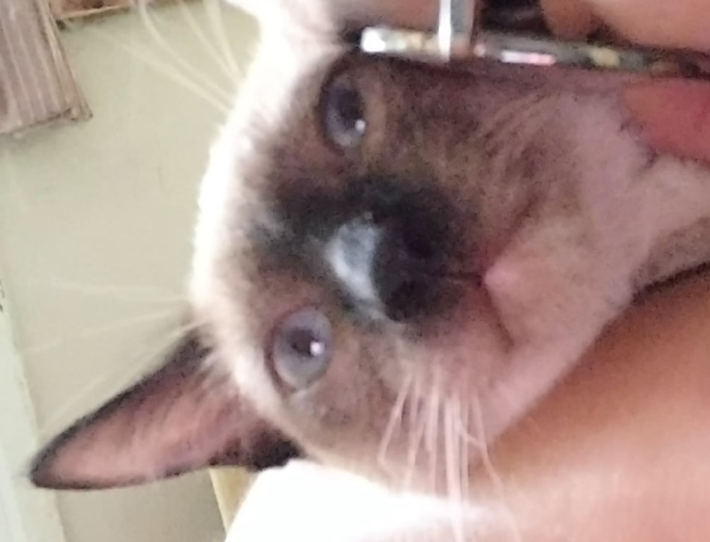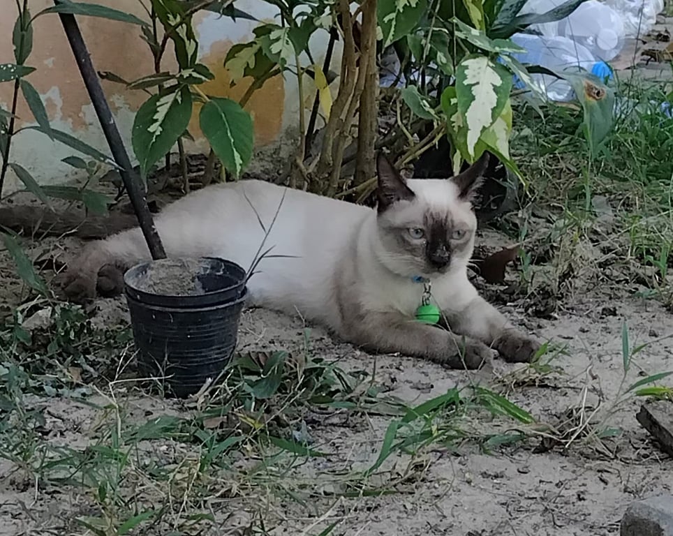 รอยตำหนิ หนังตาตกนิดหน่อย หางมีลาย ปอกคอสีฟ้ามีกระดิ่ง2ลูกสีเขียวอันนึง