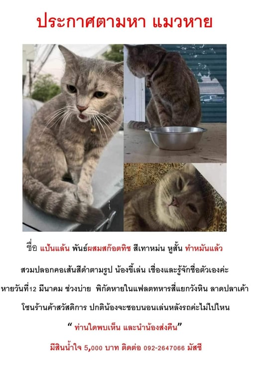 ปกติเป็นแมว ที่จะอยู่บริเวณบ้านค่ะ ไม่ข้ามตึก จะอยู่แค่หน้าร้านและบริเวณหลังรถ จับง่ายมากอยู่โซนสวัสดิการ ทหาร วงเล็บร้านกระเป๋าค่ะ หายช่วงเวลาบ่าย