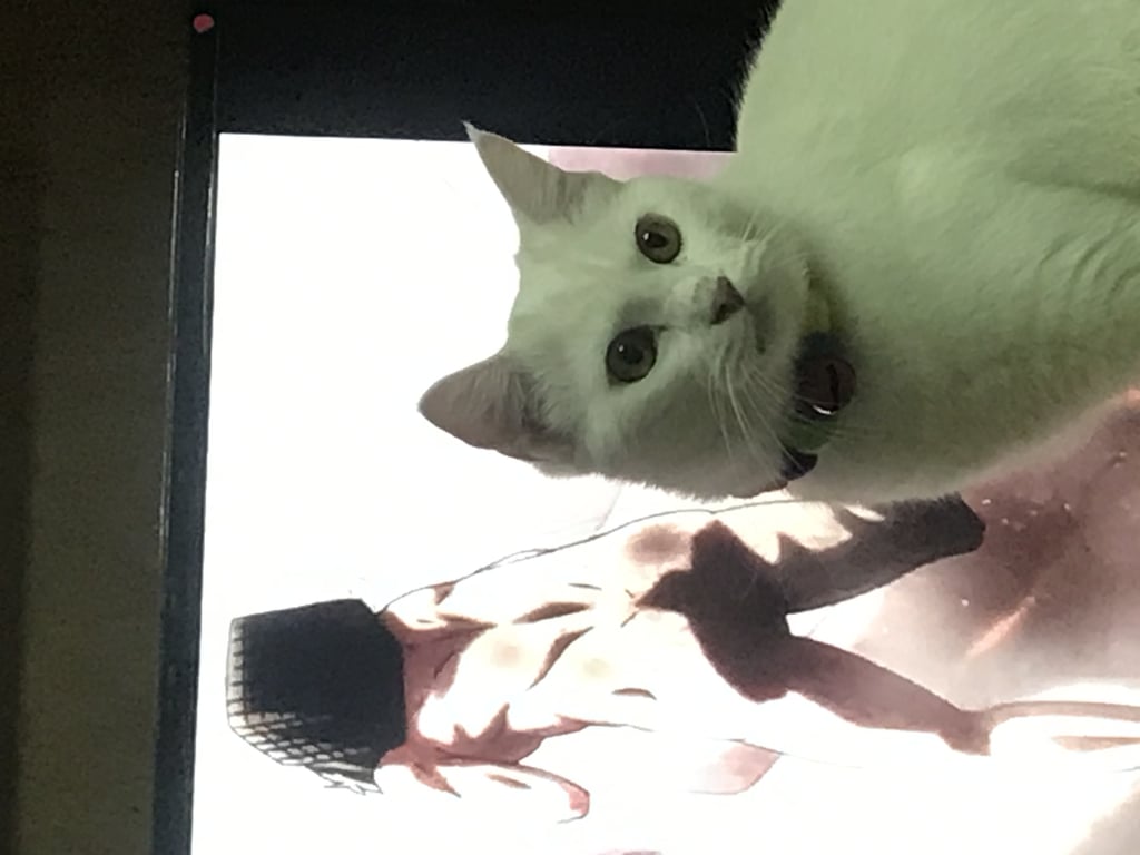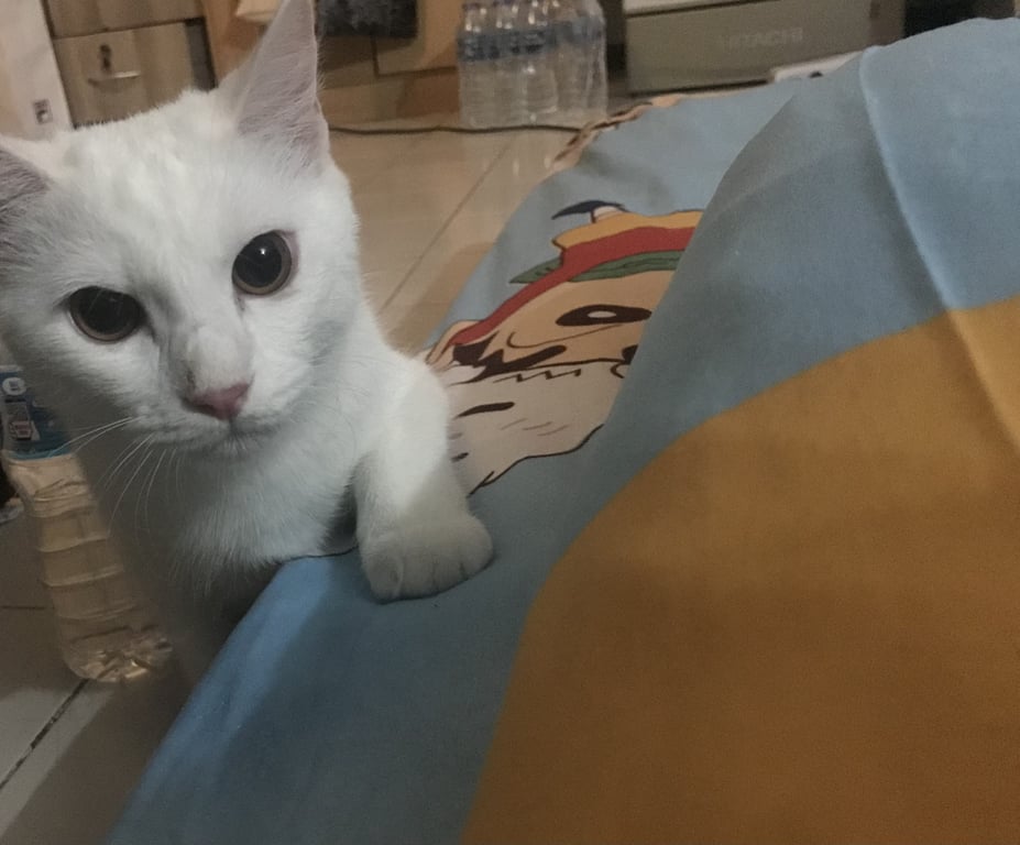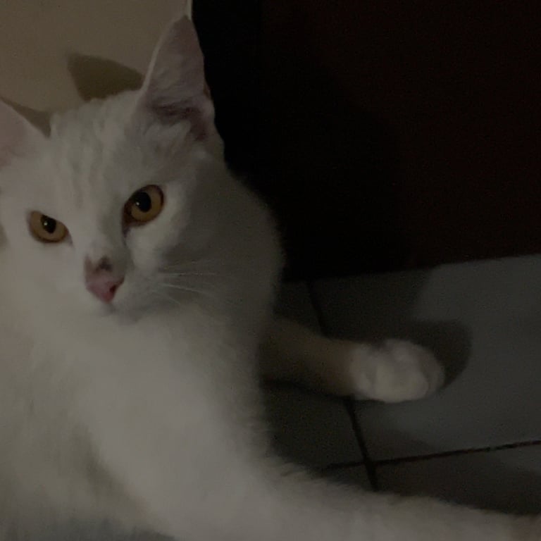 รอยตำหนิ: ตาสีเหลือง มีรอยดำตรงจมูก(เช็ดไม่ออก) ไม่ใส่ปลอกคอเป็นแมวพันธุ์ผสมสีขาวล้วน ตาสีเหลือง คนฟูแต่ไม่ยาวมาก ไม่ได้ใส่ปลอกคอ ค่อนข้างตื่นคน