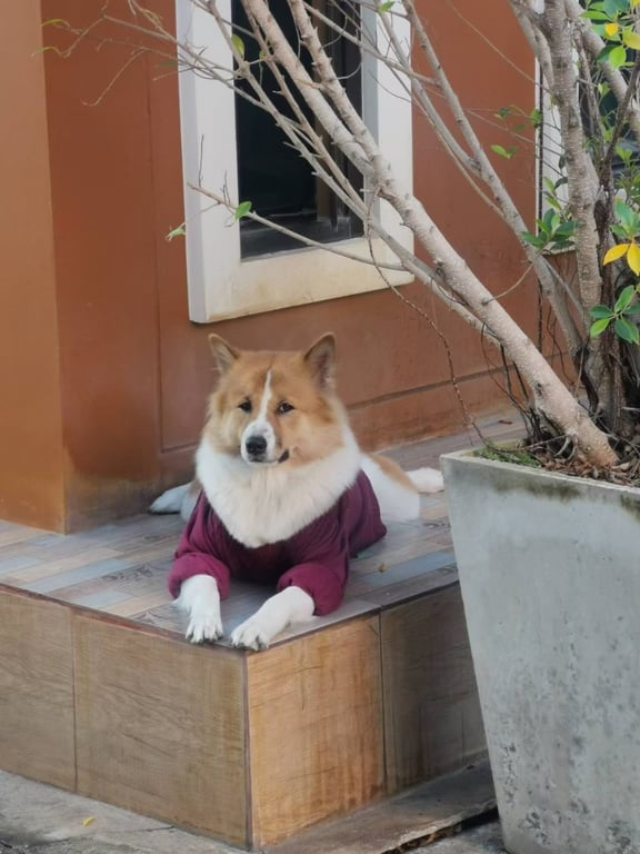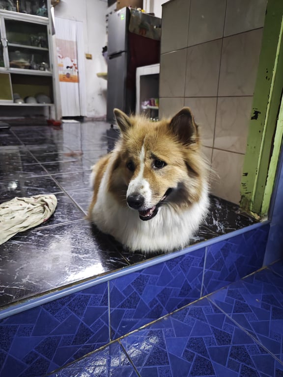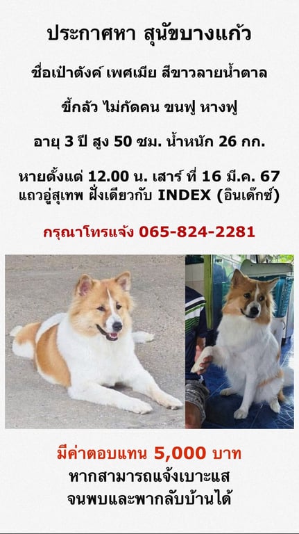 รอยตำหนิ หน้าสีน้ำตาลมีสีขาวพาดกลาง ขนฟู ตัวอ้วน สูง50cm หนัก26kg