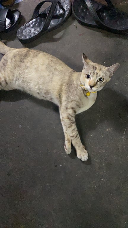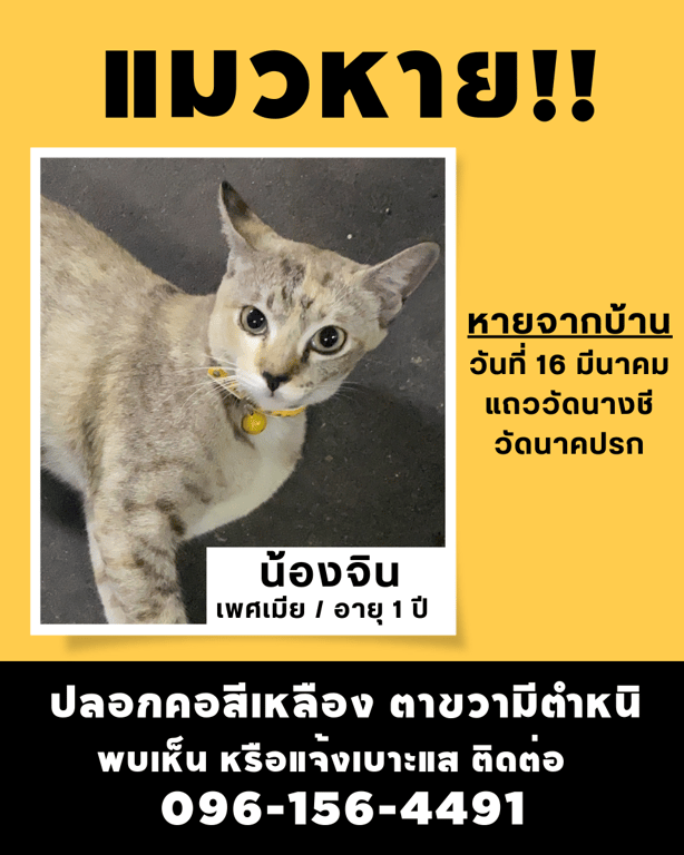 รอยตำหนิ ใต้ตาขวามีตำหนิ แหว่งเล็กน้อย หางยาวมาก วันที่หายมีปลอกคอสีเหลือง