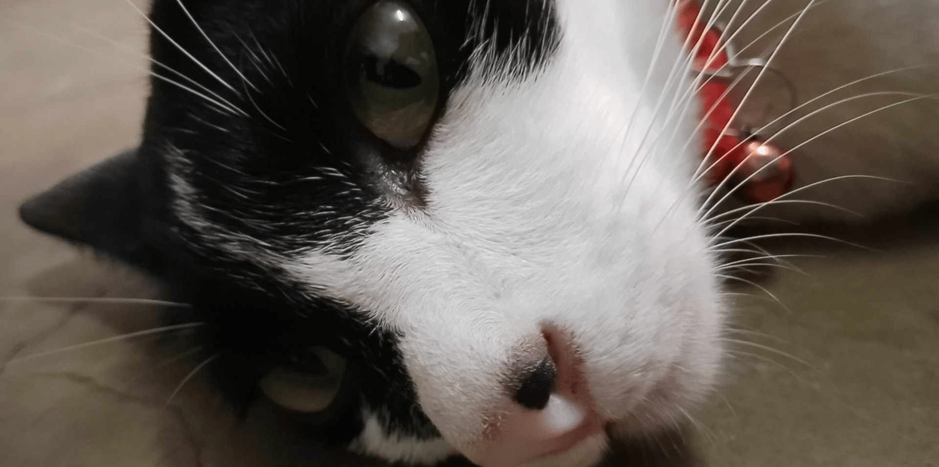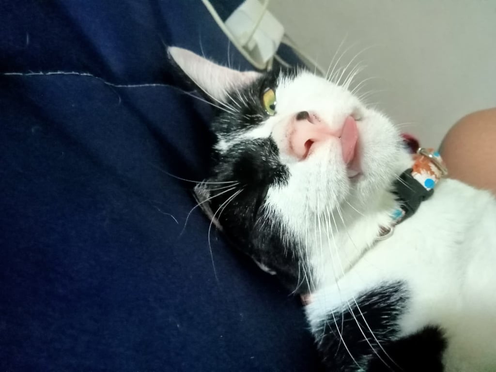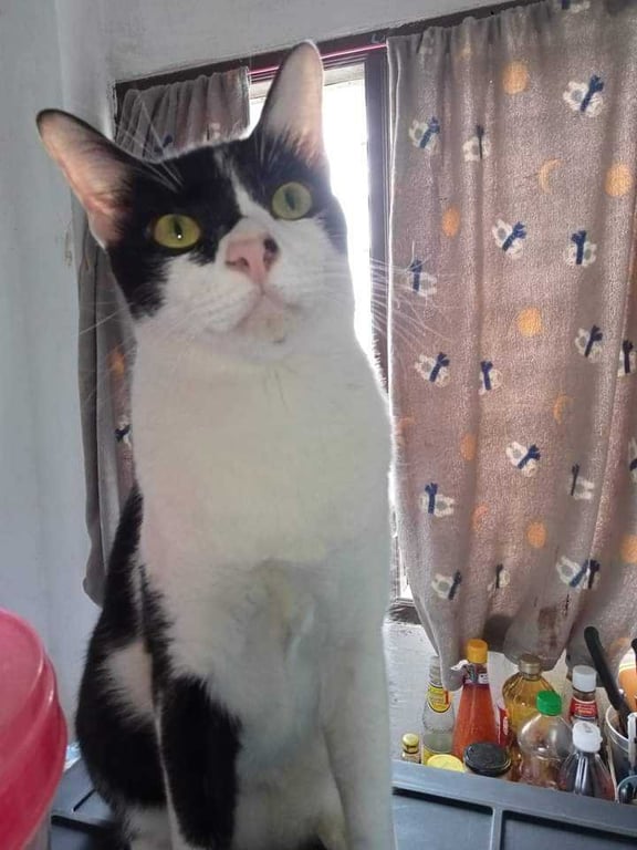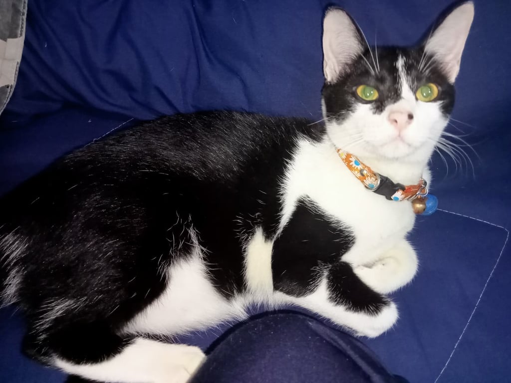 ตัวอ้วน ลายขาวดำ มีจุดดำตรงจมูก ปลอกคอสีส้ม