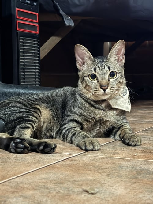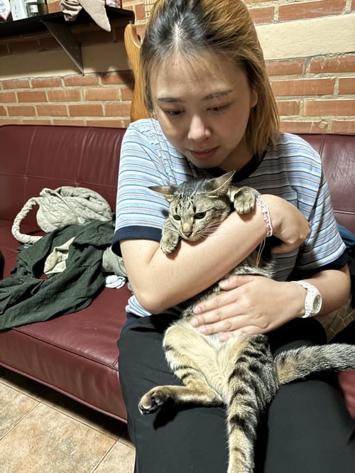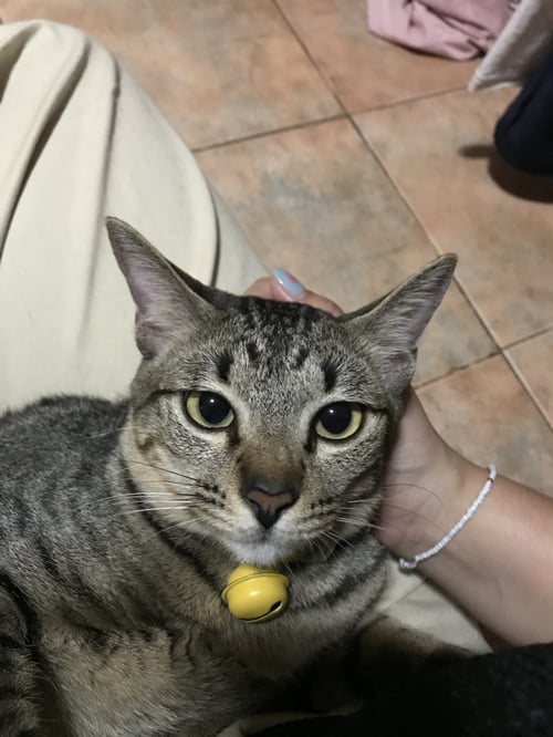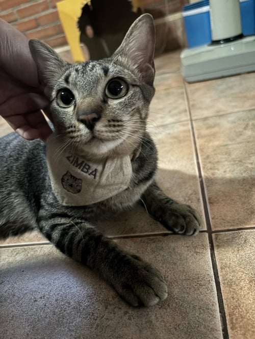 น้องขี้กลัว ใส่ปลอกคอผ้าสีครีม ปักชื่อ zimba