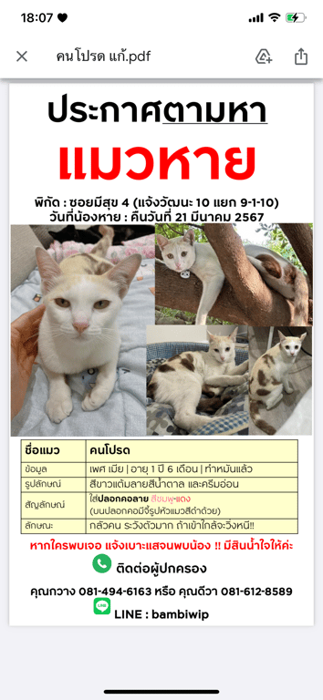 ตัวไม่ใหญ่มาก ค่อนข้างระวังตัวมาก กลัวคน และปราดเปรียว ที่คอมีปอกคอสีแดง-ชมพู และจี้ลายหัวแมวสีดำ พร้อมเบอร์โทรเจ้าของค่ะ