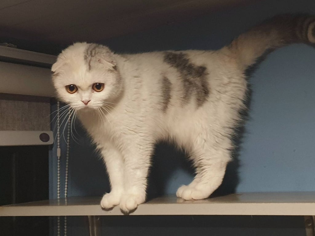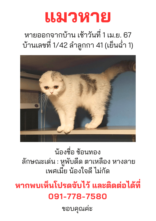 รอยตำหนิ: หูพับ ตาเหลือง หางลายใจดี ไม่กัด จำชื่อตัวเองได้
