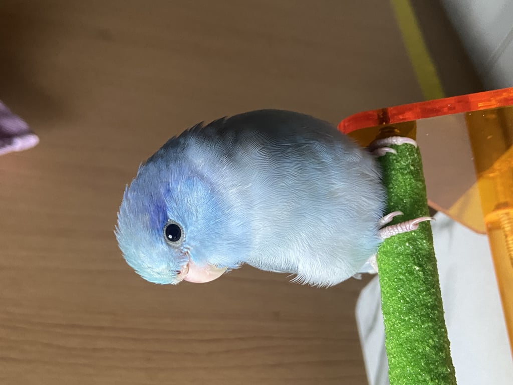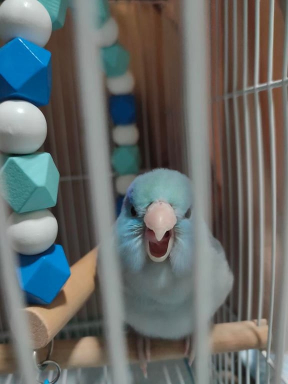 รอยตำหนิ: ที่หัวสีเขียวมีแต้มด่างสีขาวน้องมีห่วงข้อเท้าสีม่วง ที่ห่วงมีเบอร์ติดต่อ