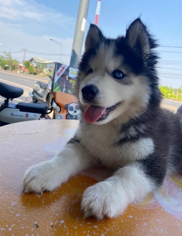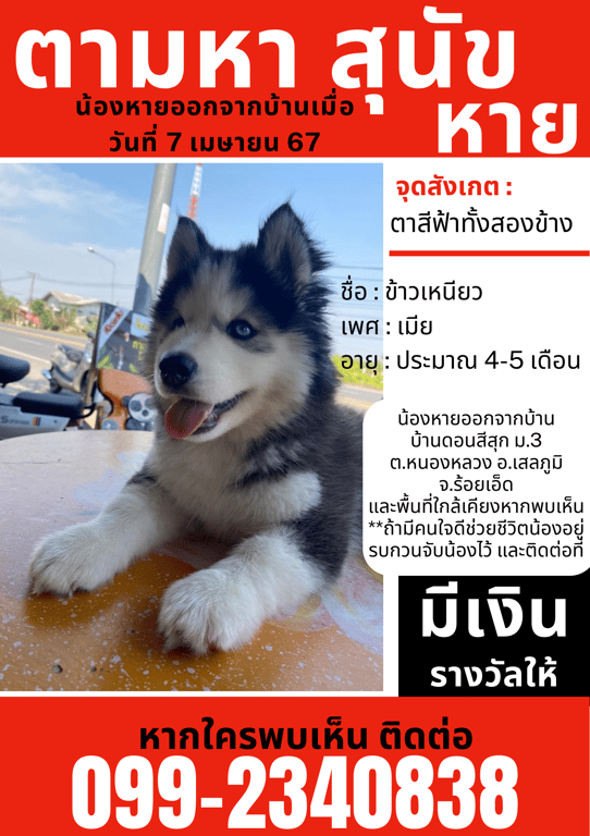 รอยตำหนิ: ตาสีฟ้าใส 2 ข้างน้องกลัวคน ถ้าไม่รู้จักน้องจะไม่ให้จับเลย และขี้ร้อน ชอบอยู่กับน้ำ ที่เย็นๆ