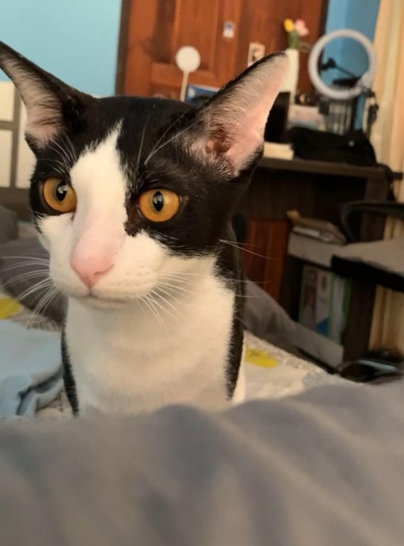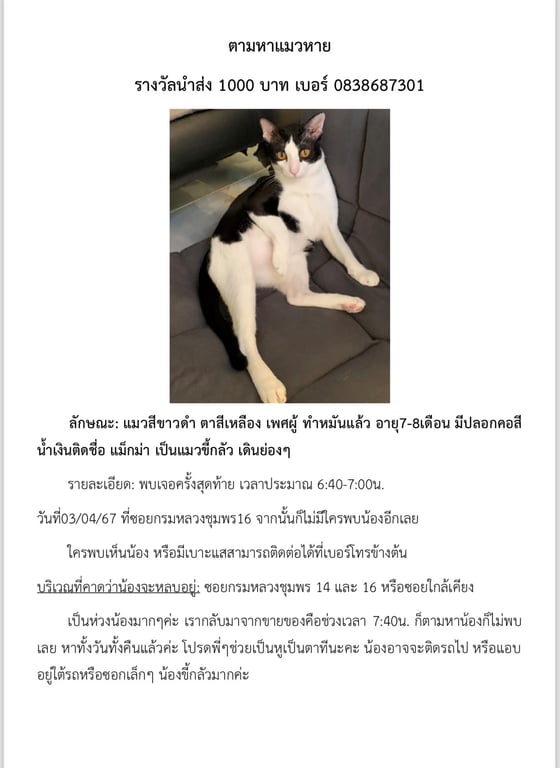รอยตำหนิ: หน้าน้องเหมือนแมวใส่หน้ากากใส่ปลอกคอสีน้ำเงินมีกระดิ่ง1อัน แมวขี้กลัว ขี้ตกใจ กลัวรถ กลัวคน น้องมีตาสีเหลือง