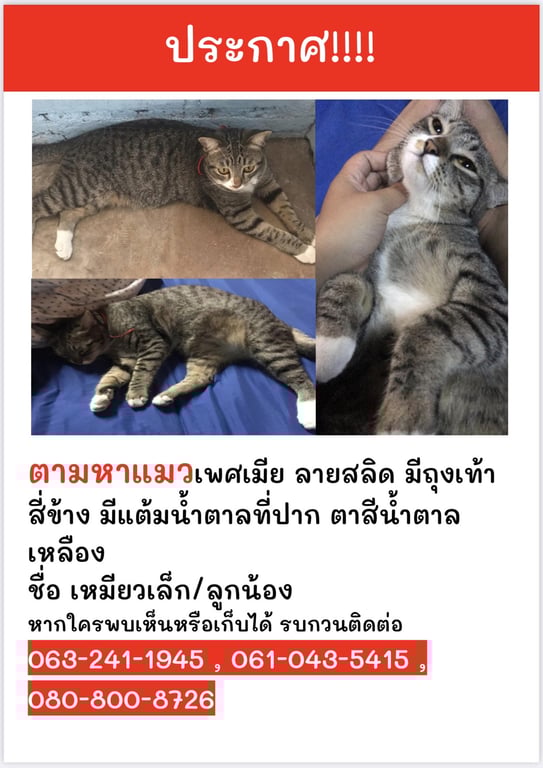 รอยตำหนิ: มีจุดสีน้ำตาลที่ข้างปากและจมูก มีถุงเท้าสีขาวสี่ข้างเป็นแมวที่ติดคนมากๆและจำชื่อตัวเองได้