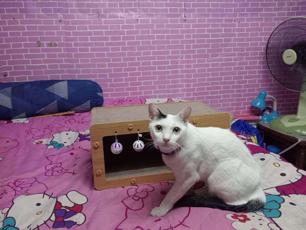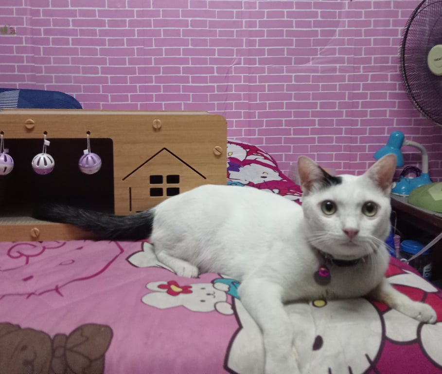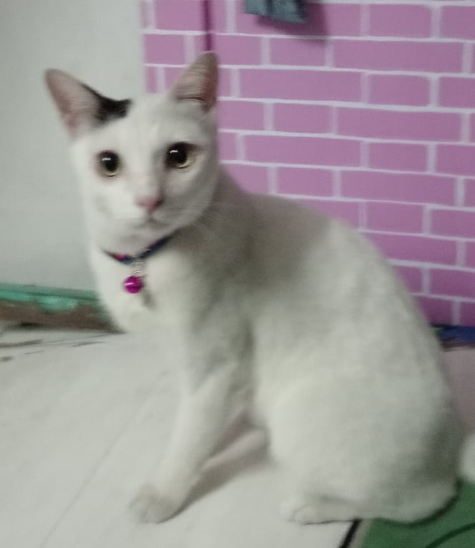 รอยตำหนิ: จุดที่หัวข้างขวาสีดำ หางสีดำเชื่อง ไม่ดุ ต้องตกใจมากแล้ววิ่งหายไป มีปลอกคอสีฟ้าชมพู มีชื่อและเบอร์โทรที่จี้ห้อยคอ มีโซ่ยาวติดปลอกคอไปด้วย