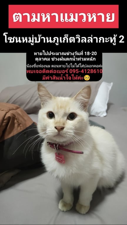 รอยตำหนิ: ขนยาว หางยาววันที่หาย ไม่ได้ใส่ปลอกคอค่ะ