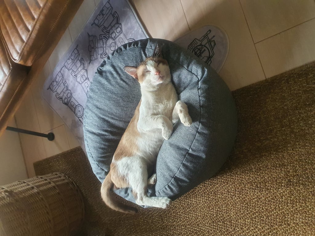 น้องไม่สวมปลอกคอ ตาสีฟ้า ขนไม่ยาวมาก ออกหยาบ มีรอยขวนเต็มตัว ไม่ชอบอาบน้ำ หูและหางสีน้ำตาลเต็ม โคนหางขนแหว่งยาว จมูกมีแผลเล็กน้อย อาจออกเสียงเหมียวไม่ค่อยได้ดี ไม่กินข้าวสุก กินแต่ปลาและหมูหยอง