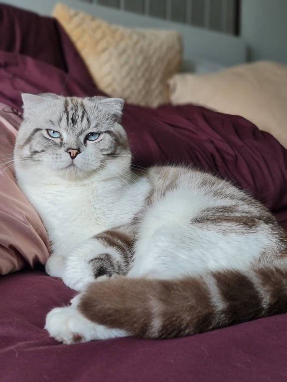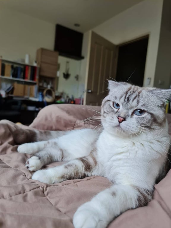 สี: สีขาวน้ำตาล ลายสลิด ตาสีฟ้า