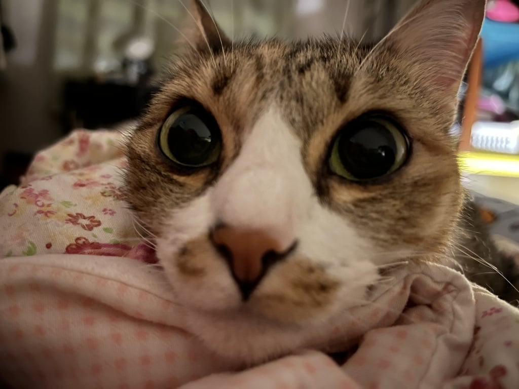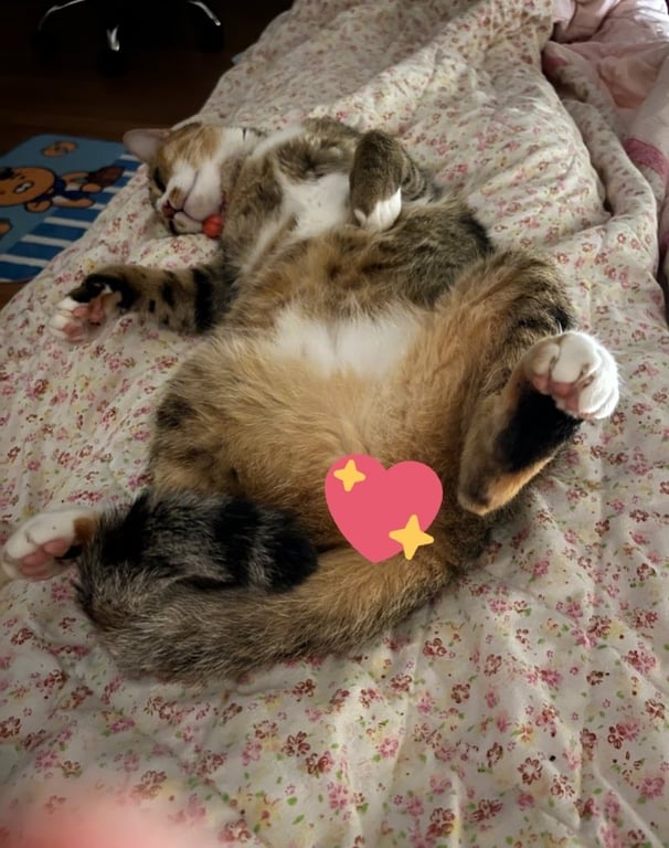 รอยตำหนิ: มีถุงเท้าขาวทั้งสองข้างเป็นลายโค้งต่อกัน ตรงจมูกที่เป็นสีขาวมีแต้มสีน้ำตาลอ่อนตรงข้างจมูกขวาและจมูกล่างซ้าย ช่วงจมูก-คางถึงแผงคอเป็นขนสีขาวสนิท พุงล่างมีขนสีขาวหย่อมเล็กๆ และไล่เป็นสีน้ำตาลอ่อน มีลายถตัวเบา ขี้กลัวขี้ตกใจ ชอบซ่อนตัว กลัวสเปรย์ถ้าเห็นขวดสเปรย์จะกระพริบตาบ่อย/ขยิบตาและเดินหนี กลัวเสียงถุงพลาสติก ถ้าถูกอุ้มจะร้องบ่นโวยวาย